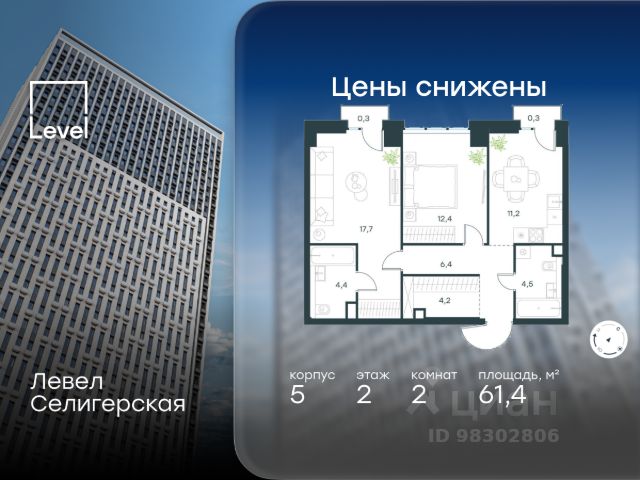 Цена указана с учётом скидки при 100%-й оплате, несубсидированной ипотеке, рассрочке (кроме программы "Рассрочка 0%"). В жилом квартале, расположенном в южной части района Западное Дегунино, продаётся 2-комнатная квартира площадью 62.50 кв.м без отделки. Квартира расположена на 7 этаже 40-этажного корпуса 5 в жилом комплексе комфорт-класса Левел Селигерская (компания Level Group/Левел групп). Отличная транспортная доступность: - 10 мин. пешком до станции метро "Верхние Лихоборы"; - 15 мин. пешком до станции метро "Селигерская"; - 20 мин. пешком до станции МЦД-3 "Моссельмаш"; - 11 мин. на авто до МКАД; - 13 мин. на авто до ТТК; - 16 мин. на авто до Садового кольца. Расположение Район отличается богатой социальной инфраструктурой: школы, детские сады, поликлиники, магазины, фитнес-клубы, торговые центры - всё близко к дому. Рядом с Левел Селигерская расположено 5 парковых зон. В 3 минутах от дома расположен перспективный сквер-парк. В 10 минутах пешком находится парк им. Святослава Фёдорова, в 13 минутах на велосипеде - парк "Ангарские пруды". В 7-11 минутах на автомобиле - два крупных природных объекта: Тимирязевский парк и Главный ботанический сад Российской академии наук. Благоустройство Внутренние дворы жилого комплекса огорожены от машин, а их функциональное наполнение отличается в зависимости от очереди строительства. На территории 2-й очереди жителей ждут уютные навесы с качелями, павильон-читальня, волейбольная площадка, беседки, а также детские и спортивные площадки. Технологии и инженерия Для входа на территорию комплекса предусмотрен единый ключ доступа. Все общественные зоны оснащены камерами видеонаблюдения, по заявке собственнику предоставляется возможность просмотра изображения отдельных видеокамер на его мобильном устройстве. При въезде в паркинг функционирует система распознавания госномеров. Кроме того, для комфорта жителей создано мобильное приложение, с помощью которого можно удаленно контролировать доступ на придомовую и жилую территории. Другие преимущества жилого комплекса - Высокая освещённость квартир: в большинстве из них не менее трёх окон; - Супермаркет, магазины, кафе, пекарни и многое другое на первых этажах домов; - Частный детский сад; - Стильные дизайнерские лобби с высокими потолками до 4,3 м. и окнами в пол, для питомцев предусмотрена лапомойка; - 30+ планировочных решений: от компактных студий до просторных семейных квартир; - С каждого этажа дома на лифте можно спуститься в подземный отапливаемый паркинг."