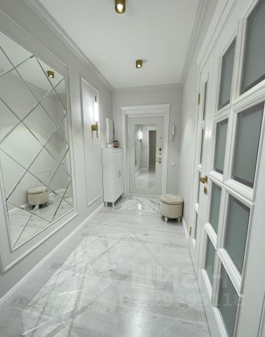 Спальня с двумя окнами в "пол". Установлен спальный гарнитур с большой кроватью шириной и длинной 2м.*2м. производства "Аскона". Матрац ортопедический, средней жесткости. Также две прикроватные тумбы, выпаленные в одинаковой с кроватью обивке, в цвете молочный белый. Обивка - также покрытие Ever clean, которое создает водоотталкивающий эффект. На тумбах светильники, в абажуре из этой же ткани, производства "Аскона". Шкаф огромный и очень вместительный, ширина- 3 метра, высота 3 метра. Имеется отделения для ремней и ювелирных изделий, а также 4 больших выдвижных ящика