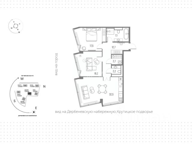 В клубном корпусе 3 "Heart Tower" расположена светлая 3 комнатная квартира с готовой дизайнерской отделкой и панорамными окнами.