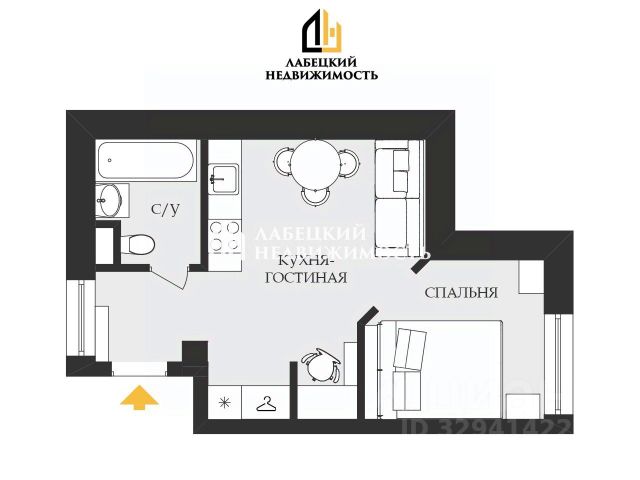 - Грамотное ЗОНИРОВАНИЕ. Выделена ЗОНА СПАЛЬНИ с двуспальной кроватью. А также выделена ниша для рабочего места.