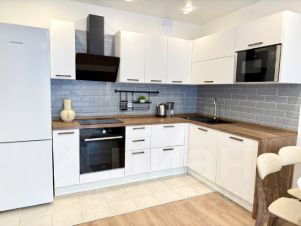 Австрийский кухонный гарнитур Блюм с доводчиками и поворотными механизмами, встроенная техника - вытяжка, холодильник, отдельная морозилка, посудомоечная машина, микроволновая печь и духовка.