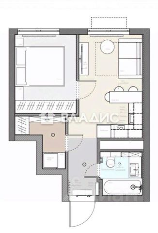 • функциональная планировка: Кухня-гостинная с полноценным двухместным раскладным диваном, спальня с кроватью на заказ и большим, вместительным встроенным шкафом во всю стену, отдельная гардеробная комната с продуманной зоной хранения, а также совмещённый санузел. Окна выходят во двор. Площадь по ЕГРН 32.1м²