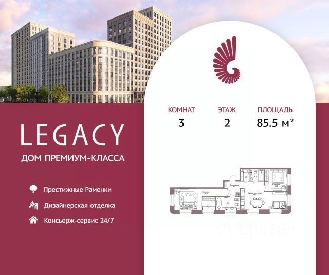 Светлая квартира общей площадью 83 м2 на 4-м этаже премиального жилого комплекса Legacy, расположенного в прекрасном зеленом районе Раменки. Отличная функциональная планировка: кухня-гостиная, 2 мастер-спальни со своими с/у и продуманной гардеробной зоной; гостевой санузел и просторный холл, который с первых шагов погружает в безупречное пространство изысканности и уюта. Жилое пространство спроектировано для исключительно комфортной жизни с возможностью реализации уникального дизайн-проекта. Для удобства будущих резидентов доступны два варианта отделки от застройщика: Premium и Elite премиальные материалы в отделке, мебель от европейских производителей, и освещение индивидуального изготовления. Жилой комплекс Legacy располагается на Мичуринском проспекте в районе с развитой инфраструктурой, богатой историей и высокой транспортной доступностью. Москва-река, Ботанический сад МГУ, главный корпус МГУ и Воробьевы горы на расстоянии прогулки от комплекса. Проект состоит из 9 секций переменной этажности от 8 до 17 этажей. В каждой секции не более 5 квартир на этаже, что обеспечивает высокий уровень приватности. Архитектура Проект Legacy разработан архитектурным бюро Speech. Его строгая лаконичность дополнена современными стандартами роскошной и комфортной жизни это бессменная классика, которая всегда вне моды. Благоустройство Свой приватный двор-сквер площадью 3 600 м2 с пространствами для всех возрастов: на территории располагаются игровые площадки, детский городок, песочница, воркаут-зоны, батуты, места для отдыха, лабиринты, настольный теннис и шахматные столы. Презентабельные лобби Дизайнерские лобби и холлы с премиальной отделкой. Изысканный стиль и высококачественные европейские материалы, отражающие высокий статус резидентов дома. Инфраструктура в доме Магазины, салон красоты, спортивная студия на первом этаже. А также ресторан Seasons, который позволяет разнообразить рацион и сделать каждый ужин особенным. Комфорт и безопасность Премиальный консьерж-сервис 24/7, круглосуточная охрана, видеонаблюдение, система СКУД, закрытый охраняемый паркинг и эксклюзивное мобильное приложение для решения бытовых вопросов резидентов. Купить квартиру с евроремонтом рядом с метро Раменки.