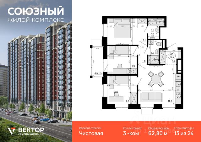 Продается 2-комн. квартира площадью 52,6 кв.м на 3 этаже 21 этажного дома в ЖК "Союзный" от федерального девелопера ГК "Вектор". ЖК Союзный Расположение, транспортная доступность Жилой комплекс "Союзный" - это квартал из 6 монолитных домов комфорт-класса высотой до 25 этажей, строящийся в 8-ом микрорайоне города Одинцово на улице Маковского. - 8 км от МКАД; - 15 минут пешком до станции "Одинцово" МЦД-1; - рядом находится автобусная остановка, от которой можно доехать до метро "Парк Победы", "Киевская", "Юго-Западная"; На личном автотранспорте доехать от комплекса по Минскому шоссе к новой развязке с МКАД можно примерно за 20 минут. В качестве альтернативы можно выбрать Можайское шоссе. Даже в час пик передвигаться по нему можно со скоростью 50 км/ч. Кроме того, можно выбрать платную трассу Северный обход Одинцово. Путь от квартала до Северо-Западной хорды на автомобиле займет 25-35 минут, а до ТТК и Садового кольца - 1 час. Инфраструктура В квартале запланировано строительство торгового центра, детского сада на 245 мест (сдача - 4 кв 2025 г.), многоуровневой открытой стоянки на 257 автомобилей, многоуровневого подземного паркинга, наземно-подземного паркинга с эксплуатируемой кровлей и других объектов. На внутренней территории квартала разместятся детский игровой комплекс с резиновым покрытием, спортплощадка, зоны отдыха для взрослых, деревья, кустарники и газоны. В шаговой доступности от ЖК "Союзный" располагаются школа, детский сад, профучилище, несколько ТЦ, кинотеатр "Юность", Ледовый дворец, сквер Союзный, Глазынинский пруд с качелями и площадкой для хоккея. В районе ЖК нет промышленных производств, а совсем близко начинаются лесные массивы, занимающие площадь свыше 70 000 га. Этот район считается одним из самых экологически чистых в Подмосковье. Надежность застройщика ГК "Вектор" - федеральный девелопер полного цикла. Группа компаний основана в 2014 году и сейчас занимает достойное место среди лидеров рынка недвижимости в топ-100 застройщиков. Портфель проектов составляет свыше миллиона квадратных метров жилья и инфраструктуры, включая жилые и коммерческие помещения, детские сады, а также рекреационные зоны в Подмосковье (4 жилых комплекса в Одинцовском районе) и Краснодарском крае. Вектор активно развивается на рынке девелопмента, сформировав команду профессионалов отрасли в составе более 300 человек. На данный момент более 80 тыс. кв.м. жилой площади в активной стадии строительства жилья. Застройщиком ЖК "Союзный" является компания "Стройтек", созданная в 2004 году и оказывающая строительно-монтажные услуги в Москве и Подмосковье. Приоритетные направления ее деятельности строительство, реконструкция и ремонт объектов недвижимости различного назначения. При этом, компания осуществляет весь цикл работ, обеспечивая не только качественное возведение жилых объектов, но и обустройство всей прилегающей к ним территории. Архитектура При проектировании фасадов зданий ЖК "Союзный" используются классические приемы реализации кирпичн