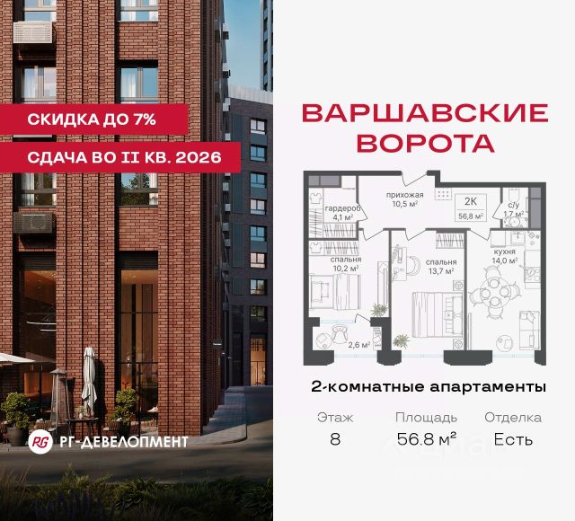 Продаются 2-комнатные апартаменты 56.3 кв.м. в МФК "Варшавские ворота" на 8-м этаже 30 этажного дома. МФК "Варшавские ворота" — это точка баланса между природой и городом, стилем и функциональностью, жизнью сегодня и устойчивым будущим. Коротко о важном: - 1 минута пешком от м. Аннино; - Удобные выезды на Варшавское шоссе и МКАД; - Высота потолков 2,7 - 3 м; - Закрытый двор-парк; - Школы и детские сады в 10-15 минутах пешком от дома; - Технические лоджии для размещения кондиционеров; - Подземный паркинг; - РГ-Девелопмент — ТОП-20 крупнейших застройщиков Москвы. Проект сочетает в себе современную архитектуру и продуманное благоустройство с уникальным природным окружением. Всего в нескольких минутах от дома — девять парков, каскад прудов и крупнейшие лесопарковые зоны Москвы, создающие ощущение жизни в зеленом оазисе посреди мегаполиса. Архитектурная концепция - стиль Чикаго в Москве. Фасады облицованы вентфасадами под клинкерную плитку. Фасады подчеркивают строгие линии и современный стиль, а входные группы разработаны московским бюро Синтаксис. Вестибюли оформлены с применением керамогранита, декоративной штукатурки и гипсовых панелей, детали из латуни добавляют изысканности. Проект находится в 1 минуте пешком от метро "Аннино", в 12 минутах от станции "Улица Академика Янгеля" и рядом с МЦД-2 "Красный Строитель". Для автомобилистов предусмотрен прямой выезд на Варшавское шоссе и два съезда на МКАД, что позволяет быстро добираться в любую часть города. Среди планировочных решений представлены разнообразные форматы: от функциональных студий до просторных 4-комнатных квартир и апартаментов. Высокие потолки усиливают ощущение простора, а продуманные планировки включают мастер-спальни, гардеробные, объединённые кухни-гостиные и несколько санузлов. Центральное пространство комплекса — закрытый двор без машин. Он разделён на функциональные зоны: детские игровые комплексы, спортивные площадки и уютные места для тихого отдыха. На первых этажах разместятся магазины, кафе и сервисы, что позволит решать повседневные задачи, не покидая территорию комплекса. Для семей с детьми предусмотрен частный детский сад на 50 мест. Подземная парковка и кладовые обеспечат удобство хранения и безопасность автомобилей. Комплекс окружён девятью парками и лесопарками, каждый из которых обладает своей атмосферой. Выйти на пробежку в Аннинском лесопарке, насладиться прогулками по аллеям в Битцевском лесу, спланировать пикник или велопрогулку в Покровском парке, любоваться каскадом Кировоградских прудов. Всего в двух станциях — музей-заповедник "Царицыно" с дворцами, фонтанами и живописными пейзажами. Здесь каждый житель найдёт своё любимое место для отдыха. Южное Чертаново - район развитой инфраструктурой, где сочетаются городские удобства и природное окружение. В шаговой доступности находятся школы, детские сады, спортивные комплексы и торговые центры. Это спокойный и благоустроенный район.