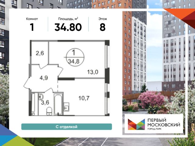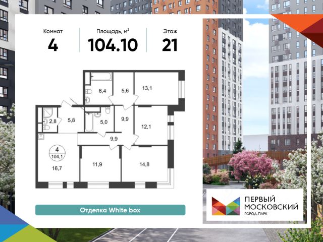 Продается четырехкомнатная квартира с отделкой в новой 11 фазе города-парка "Первый Московский". Общая площадь квартиры - 104,1 кв. м, этаж - 21 из 22. Срок сдачи - 4 квартал 2025 года. Тип дома - монолитный. Цена указана при 100% оплате. Город-парк "Первый Московский" расположен всего в 7 км по Киевскому шоссе (Новая Москва). Из города-парка есть удобный выезд на Киевское шоссе. ТРАНСПОРТНАЯ ДОСТУПНОСТЬ: - 7 мин. на личном автомобиле или 10 мин. на автобусе до станции метро "Филатов Луг" - 10 мин. на автомобиле или 20 мин. на автобусе до станции метро "Рассказовка" или "Саларьево" ВНУТРЕННЯЯ ИНФРАСТРУКТУРА И БЛАГОУСТРОЙСТВО: Дома 11 фазы граничат с Ульяновским лесопарком. В концепции благоустройства воссоздано ощущение естественного взрослого озеленения. Вся территория 11 фазы разделена на 2 типа: - приватное дворовое пространство с детскими игровыми площадками. Дворы свободны от машин. - прогулочные маршруты с зонами отдыха. Прогулочный маршрут объединяет дома 11 фазы в единое пространство, за счёт оригинальной геопластики создаётся уникальный разноуровневый ландшафтный узор. В каждом из домов предусмотрены кладовые помещения на -1 и жилых этажах, а также коммерческие помещения на 1 этаже. На территории новой фазы запланировано строительство 2 многоуровневых паркингов. АВТОРСКИЙ ДИЗАЙН: Входные группы выполнены по авторскому дизайну, оснащены системой "тёплый пол". В каждой входной группе будет располагаться комфортабельная зона ожидания с мягким диваном и кашпо с крупными растениями. При входе предусмотрено помещение для хранения колясок, на -1 этаже располагается велопарковка.