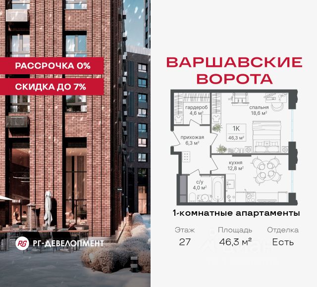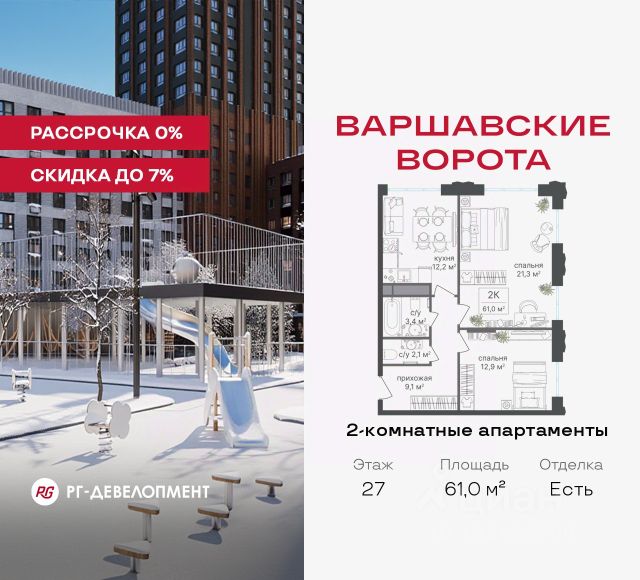 Рассрочка 0% + скидка 5%. Первый платёж 50% при ДДУ, второй 50% — через 12 мес. до ввода ЖК. Продаются 2-комнатные апартаменты 54.3 кв.м. в МФК "Варшавские ворота" на 4-м этаже 9 этажного дома. МФК "Варшавские ворота" — это проект, в котором учтен широкий спектр требований: от транспортной доступности и развитой инфраструктуры до архитектурной выразительности и экологического окружения. Апартаменты в МФК "Варшавские ворота" подойдут для тех, кто ищет продуманное жилье в Москве или готовый инвестиционный актив. Апартаменты здесь — это: - возможность жить комфортно в удобном городском формате — с природой, метро, сервисом и паркингом; - возможность купить лот с готовой отделкой, чтобы вложить минимальные инвестиции в ремонт и получить максимум возможностей от сдачи; - экономия на налоге на имущество, кадастровая стоимость апартаментов ниже ~ на 30% кадастровой стоимости квартиры; - высокая инвестиционная доходность объекта за счет более низкой цены покупки по сравнению с квартирой. Коротко о важном: - 1 минута пешком от м. Аннино; - Удобные выезды на Варшавское шоссе и МКАД; - Вид из окон на Битцевский лес и Аннинский лесопарк; - Высота потолков 2,7 - 3 м; - Закрытый двор-парк; - Школы и детские сады в 10-15 минутах пешком от дома; - Технические лоджии для размещения кондиционеров; - Подземный паркинг; - РГ-Девелопмент — ТОП-20 крупнейших застройщиков России. Проект сочетает в себе современную архитектуру и продуманное благоустройство с уникальным природным окружением. Всего в нескольких минутах от дома — девять парков, каскад прудов и крупнейшие лесопарковые зоны Москвы, создающие ощущение жизни в зеленом оазисе посреди мегаполиса. Архитектурная концепция - стиль Чикаго в Москве. Выполнена в минималистичной эстетике с использованием клинкера и декоративного кирпича. Фасады подчеркивают строгие линии и современный стиль, а входные группы разработаны московским бюро Syntaxis. Лобби оформлены с применением керамогранита, декоративной штукатурки и гипсовых панелей, детали из латуни добавляют изысканности. Пространство оживляют гербарии, композиции из сухоцветов и авторские панно. Проект находится в одной минуте пешком от метро "Аннино", в 12 минутах от станции "Улица Академика Янгеля" и рядом с МЦД-2 "Красный Строитель". Для автомобилистов предусмотрен прямой выезд на Варшавское шоссе и два съезда на МКАД, что позволяет быстро добираться в любую часть города. Среди планировочных решений представлены разнообразные форматы: от функциональных студий до просторных 4-комнатных квартир и апартаментов площадью от 22 до 105 м². Высокие потолки усиливают ощущение простора, а продуманные планировки включают мастер-спальни, гардеробные, угловые окна, объединённые кухни-гостиные и несколько санузлов. Центральное пространство комплекса — закрытый двор без машин. Он разделён на функциональные зоны: детские игровые комплексы, спортивные площадки, воркаут-зоны и уютные места для тихого отдыха. На первых этажах разместя