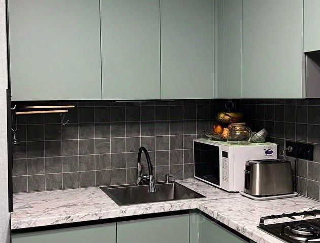 Кухня: Функциональный кухонный гарнитур с раковиной и газовой варочной панелью, а также стильная люстра.