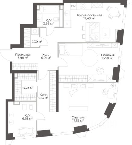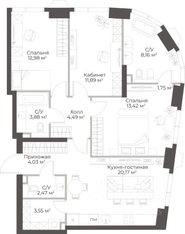 Продаётся 3-комнатная квартира в строящемся доме (Гранд Фили), срок сдачи: II-кв. 2029, общей площадью 98.71 кв.м., на 9 этаже.