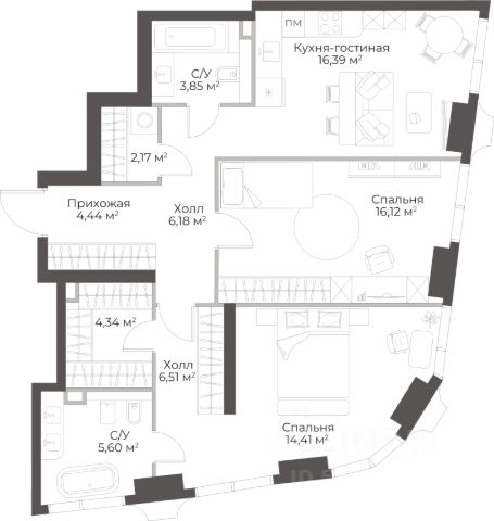 Продаётся 2-комнатная квартира в строящемся доме (Гранд Фили), срок сдачи: II-кв. 2029, общей площадью 60.41 кв.м., на 5 этаже.