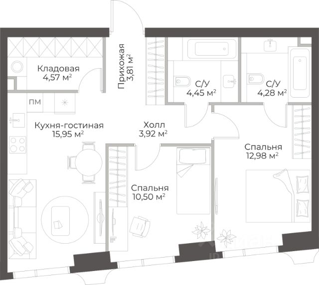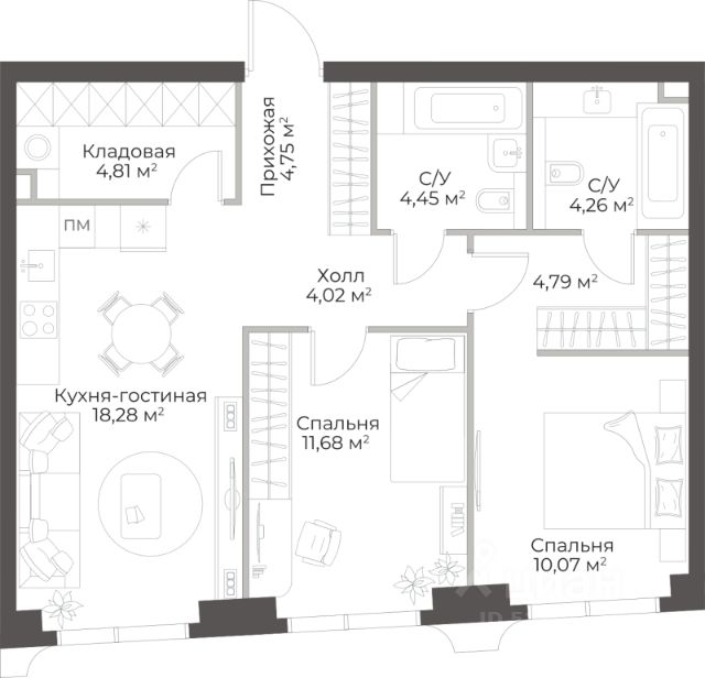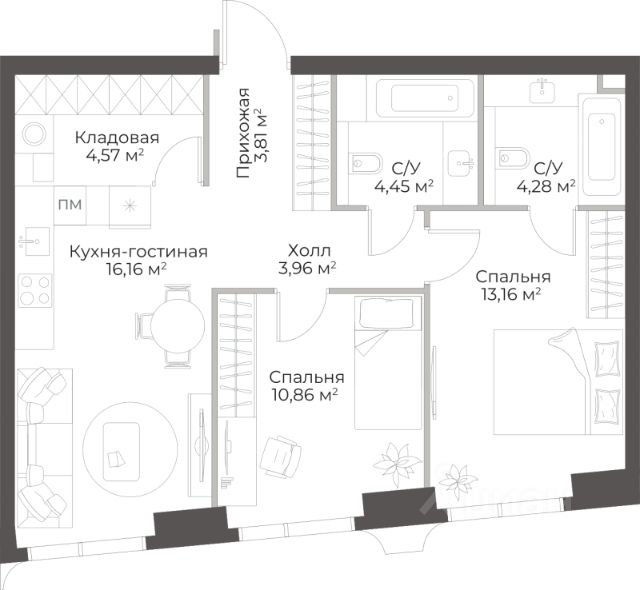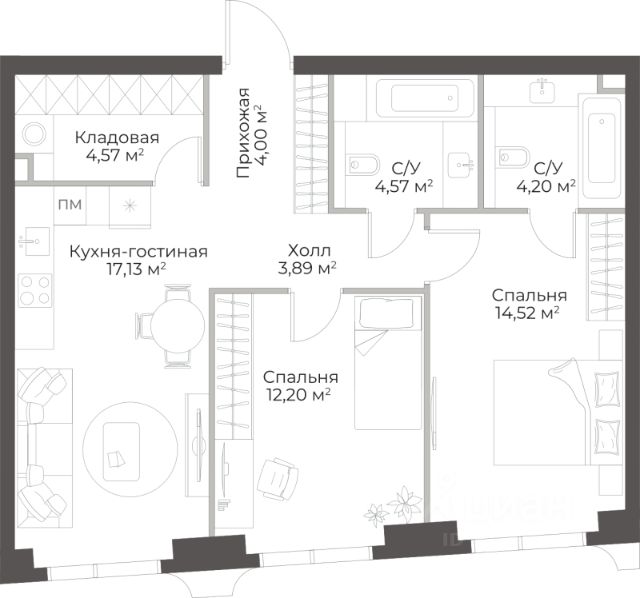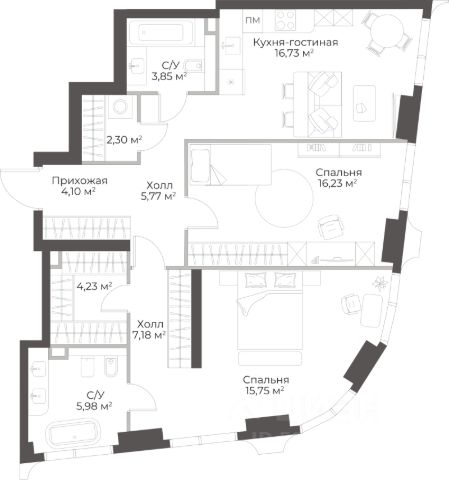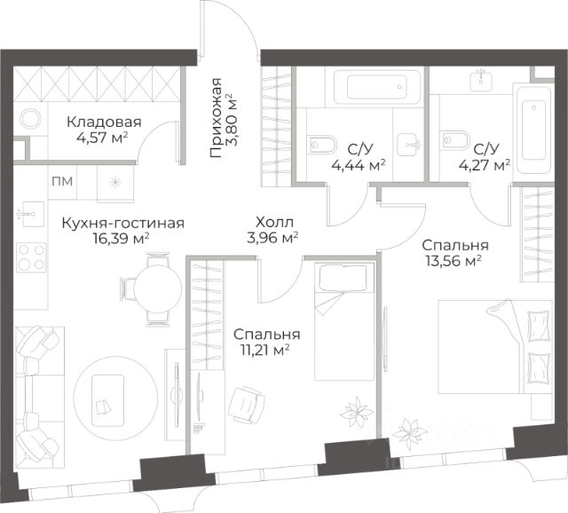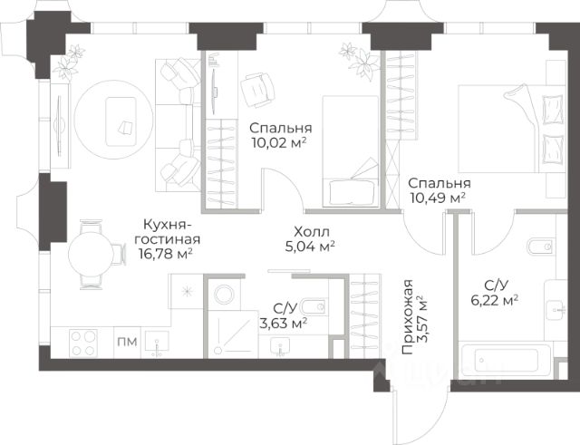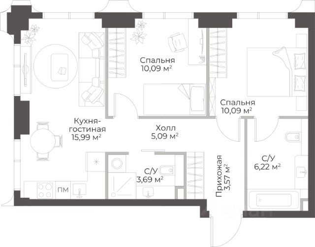 Продаётся 2-комнатная квартира в строящемся доме (Гранд Фили), срок сдачи: II-кв. 2029, общей площадью 63.12 кв.м., на 10 этаже.