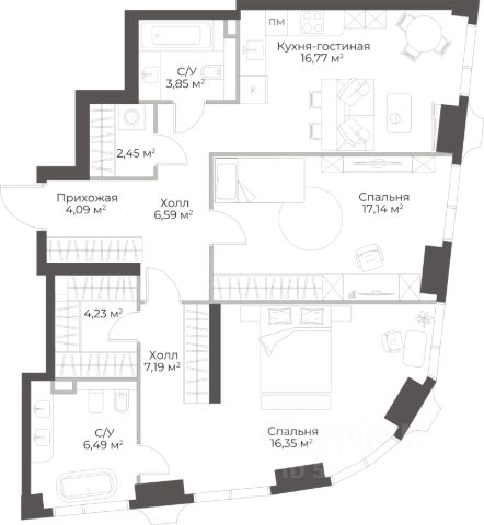 Продаётся 1-комнатная квартира в строящемся доме (Гранд Фили), срок сдачи: II-кв. 2029, общей площадью 49.35 кв.м., на 3 этаже.
