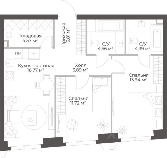 Продаётся 2-комнатная квартира в строящемся доме (Гранд Фили), срок сдачи: II-кв. 2029, общей площадью 77.78 кв.м., на 2 этаже.