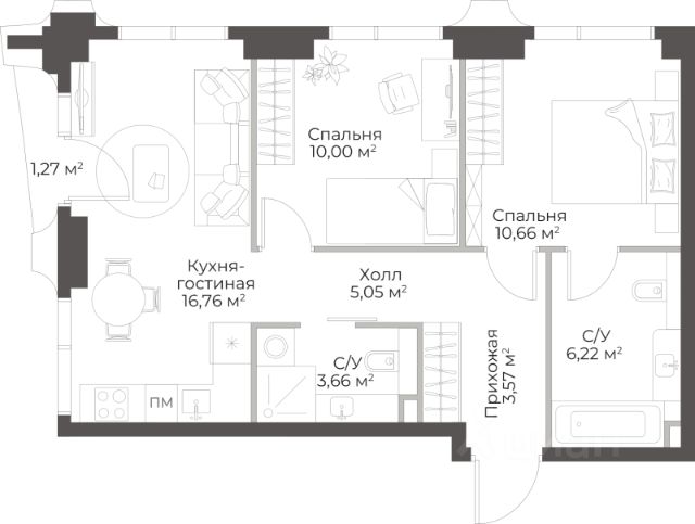 Продаётся 2-комнатная квартира в строящемся доме (Гранд Фили), срок сдачи: II-кв. 2029, общей площадью 66.03 кв.м., на 10 этаже.