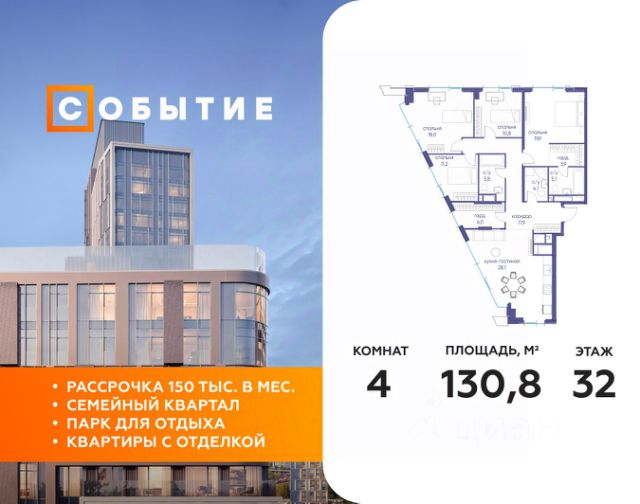 В продаже 2-к квартира от застройщика. Общая площадь 66.70, жилая 28.80, кухня 24.7. Квартира расположена на 8 этаже жилого квартала "Событие-6", корпус 1, Секция 1. Квартира без отделки. Срок сдачи: 4 кв. 2029 года. СОБЫТИЕ.6 — финальный дом парк-квартала СОБЫТИЕ на Мосфильмовской. Переезжайте в уже сформированный квартал с готовой инфраструктурой и парком! Премиальный жилой комплекс в престижном районе Москвы предлагает стильную архитектуру, продуманное благоустройство и великолепно разнообразие общественных пространств. Свой парк прямо возле дома! Архитектура Архитектура СОБЫТИЯ.6 выполнена в ультрасовременном стиле московским бюро Atrium на основе дизайн-кода британских архитекторов LDA Design и UHA London. Дом отличает оригинальная геометрия фасадов, большое остекление и высокие лобби (до 6,2 м) с авторской мебелью и светильниками. Расположение Мосфильмовская улица (Раменки) — один из престижных районов Москвы. Близость к историческому и деловому центру, природным зонам Запада столицы. Транспортная доступность: • 10 мин до Москва-Сити и ТТК; • 15 мин до Садового кольца; • 25 мин до аэропорта Внуково; • 7-10 мин до станций метро "Аминьевская" и "Мичуринский проспект". Инфраструктура: • парк "Событие" (12 га, финалист конкурса Правительства Москвы) с беговыми (1,5 км) и велодорожками (2,7 км), экотропой (1,6 км), площадками, лекторием; • школа, детский сад, магазины, салоны красоты, рестораны (к моменту заселения); • мультидвор с игровыми и спортивными площадками, мини-бульваром; • общественная терраса на 10-м этаже (коворкинг, лаунж); • Закрытые общественные пространства: детская комната, спортивный зал, коворкинг, лаунж-зоны. Паркинг 256 мест для жителей (48 — для электромобилей), 24 гостевых (5 — для электромобилей), мойки колес, кладовые, зоны для велосипедов. Окружение Парки и заповедники (Воробьёвы горы, Матвеевский лес и др.), МГУ, театр им. Н. И. Сац, стадион "Лужники". Безопасность Видеонаблюдение, контроль доступа, видеодомофоны, консьерж-сервис 24/7, системы пожарной безопасности и мультисервисная оптическая сеть.