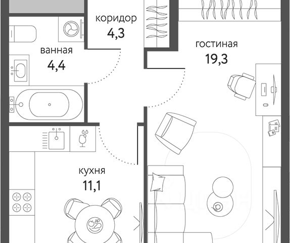 Квартира находится на 4 этаже, имеет интересную планировку: Общая площадь 45,7 м2+ лоджия 7.7 м2, кухня-гостиная 15 кв.м. с выходом на лоджию, комната 16.0 м2 с выходом на лоджию, гардеробная 3.7 м2, совмещенный санузел 4.0 м2 и просторная прихожая 5.4 м2.