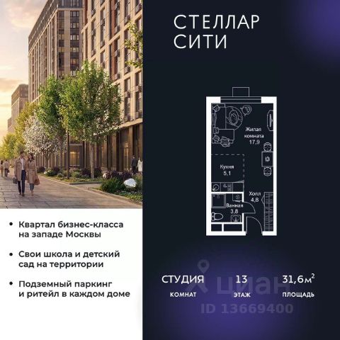 Продается квартира от надежного застройщика Tashir Estate в квартале бизнес-класса Stellar City в ЗАО Москвы. Площадь квартиры составляет: 71.7 кв. м, потолки: 3.1 м Квартира находится на 4 этаже, 4 корпуса жилого квартала Stellar City — микрогорода будущего на орбите Москвы. Stellar City — квартал в ЗАО Москвы вблизи инновационного центра Сколково. В окружении — 11 парков и природных зон, в том числе Долина реки Сетунь, Мещерский лес и парк развлечений The Rink. Город в городе Чтобы дом и инфраструктура вокруг отвечала динамичному лайфстайлу жителя мегаполиса, в основу проекта легла концепция город в городе, которая позволяет решать все бытовые вопросы in-home. В квартале будут возведены школа и детский сад, воркаут-зоны, променад, вело и беговые дорожки, детские площадки для каждого корпуса, а также коммерция на первых этажах для ежедневных покупок. Все необходимое — на расстоянии нескольких шагов. Изящные и лаконичные лобби Авторский дизайн, натуральные материалы в отделке и безупречный интерьер вне времени. Лобби и холлы в проекте бизнес-класса Stellar City ничем не отличаются от входных групп в премиум-сегменте благодаря качественным европейским материалам в отделке, стильному дизайну, консьерж-сервису и уютной зоне ожидания с журнальными столиками и мягкой мебелью. Комфорт и безопасность Закрытая территория, охрана, система СКУД, специально разработанное мобильное приложение дома для резидентов и подземный паркинг с круглосуточным наблюдением и доступом с помощью автоматического считывания номера авто.