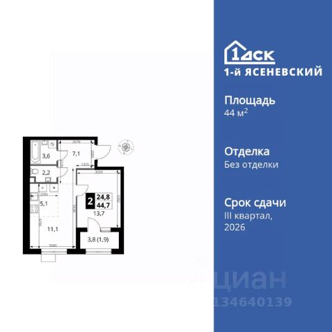 Прямая продажа от застройщика! Жилой Комплекс класса Комфорт Плюс. Продаётся 2-к квартира номер 1060 общей площадью 46.9 кв.м. на 6-м этаже 6 этажного здания. Без отделки. Особенности квартиры: - Квартиры рядом с метро - м. Корниловская 9 мин пешком - 63 га лесопарка за окнами - Школа c ИТ-кластером и бассейном. 2 детских сада - Организуем показ в удобное для вас время! - Мастер-зона с санузлом и гардеробной. Всё для вашего комфорта и удобства, включая личный санузел и гардероб. - Линейная планировка - максимальная функциональность и удобство. - Увеличенное количество окон - дополнительное освещение и свежий воздух. - Гостевой санузел - комфорт и удобство для ваших гостей. - Евроформат - просторное и удобное жилье с отличной планировкой. - Увеличенная высота потолков - ощущение простора и легкости. - Можно оборудовать рабочее место - комфорт для работы и учёбы. - Гардеробная - удобство для хранения и организации вещей. - Ниша под шкаф - компактное и удобное место для вещей. - Балкон - открытое пространство для отдыха. Квартира без отделки. Чистый холст для воплощения интерьера вашей мечты. Информация о комплексе: ЖК "1-й Ясеневский": преимущества городской инфраструктуры и природы. Пешая доступность к метро, школе с бассейном и ИТ-кластеру, а также 63 га Троицкого лесопарка под окнами. Закрытая территория с бульварами, велодорожками, кафе и дворами без машин. Фруктовые деревья и городские сады создают уникальную атмосферу. Всего в 1 км от МКАД - идеальный баланс для современной жизни. Транспортная доступность: До метро "Корниловская" - 12 минут пешком До метро "Тютчевская" - 25 минут пешком До метро "Теплый стан" - 10 минут на транспорте До метро "Ольховая" - 30 минут на общественном транспорте Личный автотранспорт: Выезд на Калужское шоссе - 500 м МКАД - 1 км Внутренняя инфраструктура: ЖК "1-й Ясеневский" - идеальное место для семей с детьми. Рядом Троицкий лесопарк для прогулок, а во дворах - современные детские площадки, разработанные с участием психологов. В шаговой доступности два детских сада и школа на 1100 мест с ИТ-кластером, бассейном и классами робототехники. Всё для счастливого детства и успешного будущего. Квартира без отделки - чистый холст для вашего интерьера.