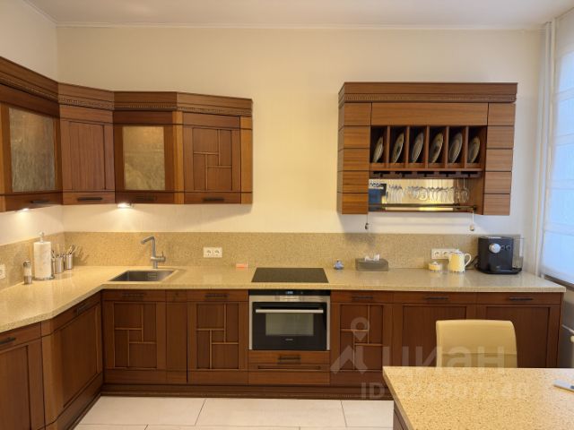 Классическая итальянская кухня из массива дерева уже установлена: широкая рабочая зона, встроенная техника, уютная обеденная зона у окна.