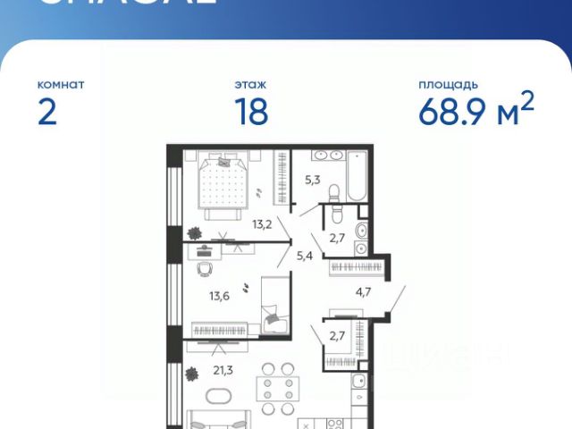 Идеальная планировка: большая гостиная, две просторных спальни, два санузла, панорамные окна в пол, высокие потолки 3,12м.