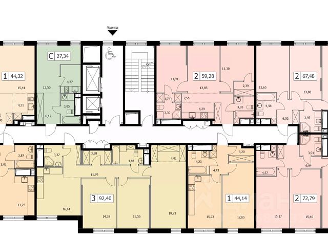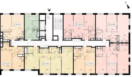 8 квартир на этаже, из них две однокомнатные, остальные 2-3-4 комнатные. 3 скоростных бесшумных лифта.