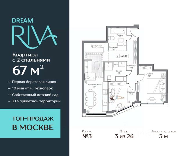 Увеличенный объем панорамного остекления создает неповторимое ощущения воздушности пространства! Двор-набережная с видами на гладь реки и кроны деревьев. Премиальный квартал DREAM RIVA — авторская архитектура в курортной концепции, воплощающей силу природных стихий в каждой детали оформления и благоустройства. Продаётся Квартира с 2 спальнями квартира на 4 этаже 26-этажного дома (3 корпус). Общая площадь: 63 кв.м. Высота потолков от 3 м. Формат приватного досуга и эксклюзивные привилегии в DREAM RIVA с приоритетным доступом для резидентов: - Первая линия Москвы-реки с открытыми видами на воду и город; - 3 Га приватного прибрежного парка с зонами для спорта и йоги; - Открытый солярий; - Школа и собственный детский сад; - Многофункциональные детские игровые площадки и детское кафе с игровой комнатой; - Клубная гостиная и lounge-бар. Локация вне конкуренции — инфраструктура полуострова предлагает всё, что нужно для размеренной жизни, работы, отдыха и развлечений: - Благоустроенная набережная с гастрогалереей; - Парк аттракционов Остров Мечты (в торговой части: рестораны, кафе, супермаркет, магазины, салон красоты, йога-студия и многое другое); - 44 Га ландшафтных парков для прогулок, спорта, пикников; - Пляжный комплекс Dream Beach Club со множеством бассейнов, ресторанов, баров и развлечений для любого возраста; - Яхт-клуб; - Вейк-парк; - Кинотеатр под открытым небом и многое другое. Удобная транспортная доступность: - Центр рядом: 15 минут до Садового кольца на авто, 20 минут до Сити или Кремля; - В 5 минутах прогулочным шагом — станция метро "Технопарк"; - Южный речной вокзал. Наши менеджеры будут рады провести для Вас консультацию и подробнее рассказать о проекте. Успейте купить на лучших условиях!