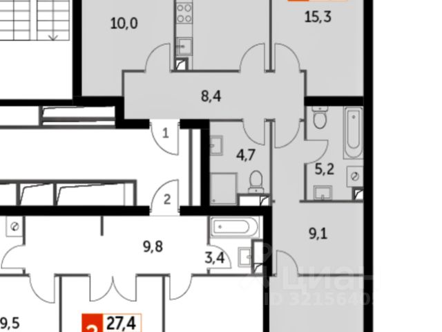 Лоджия 2,7 кв.м., гостиная-столовая 14,7 кв.м, три комнаты правильной квадратной формы - 15,6, 13,3 и 10,2 кв.м.
