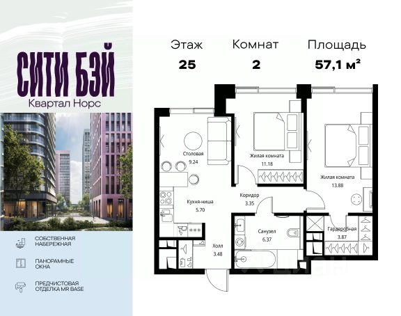 Прямая продажа от застройщика. Продаётся 2-комнатная квартира общей площадью 61.02 м² с предчистовой отделкой в ЖК Сити Бэй, квартале Норс, на 21-м этаже 27 этажного дома. Концепция жилого комплекса Сити Бэй - настоящий город в городе с отлично развитой инфраструктурой и собственной благоустроенной набережной. На территории жилого комплекса расположено пять кварталов - Атлантик, Пасифик, Индиан, Норс, Клиф. Жилой квартал Сити Бэй отличается оригинальной концепцией и выделяется среди других проектов такими характеристиками как: - Архитектура, - Виды из окон, - Природное окружение, вызывая гордость у жителей и восхищение у прохожих. Вся жизнь района Покровское-Стрешнево строится вокруг водных объектов: - Пойма реки Сходни с уникальной экосистемой, - Речка Химка и Химкинское водохранилище, - Москва-река, - Канал имени Москвы. Кругом вода, и местные с удовольствием этим пользуются. А сразу за рекой - центр водного спорта в Строгино с вейк-парком и яхт-клубами. Помимо воды, здесь очень много зелени: - Рядом Сходненский ковш памятник природы, естественный амфитеатр глубиной 40 метров; - Парк при усадьбе Братцево с фруктовым садом; - Дубовая роща "Маяк", - Алешкинский лес; - Лесопарк Покровское-Стрешнево с пляжами и бобрами. Главные транспортные артерии района: - Волоколамское шоссе, - Таганско-Краснопресненская линия метро и МЦД-2. Всего за 20 минут можно добраться до центра на машине или метро, а МЦД связывает ЖК Сити Бэй с северными, восточными и юго-восточными районами. Компания MR предлагает своим клиентам специальные условия приобретения квартир в рамках программ ипотечного кредитования от банков-партнеров.