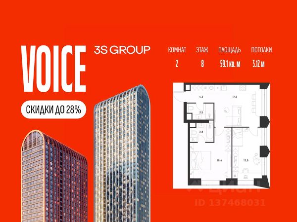 Ипотека от 3,5% на весь срок. Дополнительная скидка в офисе продаж! Продается уютная 2-комн. квартира площадью 56,3 кв.м на 3 этаже жилого комплекса бизнес-класса Voice Towers от 3S Group. Общая площадь: 56,3 кв.м., жилая: 35,3 кв.м., площадь кухни-гостиной: 20,8 кв.м., высокие потолки: 3,12 м., санузел совмещенный. О проекте: Voice. Высокие стандарты жизни Мы уверены, что высокие идеалы неизменно помогают достигать высот. Создавая Voice, мы ориентировались на людей с высокими требованиями к качеству и безупречным вкусом. Башни жилого комплекса, сочетают элегантную форму с динамичной геометрией фасадов, устремляются ввысь и отвечают самым высоким стандартам строительства. Технологичность, воплощенная в архитектуре - это ваш, собственный Voice. Преимущества локации Близость к метро Текстильщики, БКЛ и МЦК Новохохловская (10 мин) Рядом природный заповедник и конно-спортивная база Кузьминки-Люблино Будущее окружение Проект Южный порт - Текстильщики с деловым центром Сити-2 Небоскребы высотой до 300м Культурный центр с амфитеатром Променад вдоль Москвы-реки и яхт-клуб Архитектура Проект от Архитектурной мастерской Алексея Ильина Две перпендикулярные башни с арочными вершинами Высокая башня: светло-серый металл Низкая башня: терракотовая керамика Благоустройство Внешняя зона: парковки, магазины, кафе Внутренний двор: закрытая территория с озеленением Шумозащитный экран Сезонное озеленение Встречи на высоте Гранд-лобби высотой 8м Дизайнерская мебель Умные скоростные лифты Услуги Детский центр с игровой зоной Фитнес-студия для жителей