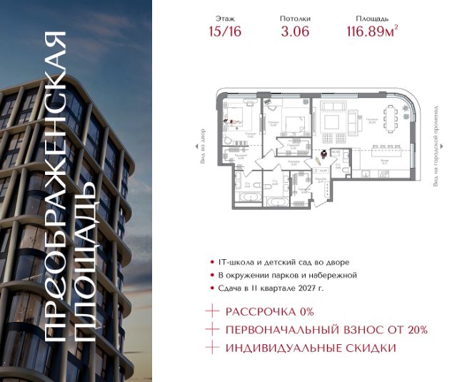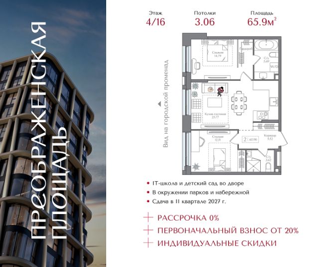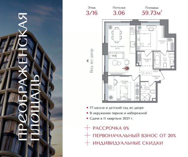 Рассрочка 0% с первоначальным взносом от 20% Индивидуальные скидки Квартира на 3 этаже в жилом комплексе премиум-класса "Преображенская площадь". Общая площадь: 59.73 кв.м. Проект премиум-класса в историческом районе Москвы. До метро "Преображенская площадь" 3 минуты пешком. Квартиры сдаются без отделки и в свободной планировке, чтобы жители могли оформить пространство с учетом своей индивидуальности. Высота потолков от 3,15м, широкоформатное остекление, 3-5 квартир на этаже. Система Умный дом. Дизайнерские лобби. Внутренний двор 1,5 га функциональное и безопасное пространство для игр, работы и занятий спортом. Пешеходный променад для прогулок. Дома переменной этажности. Есть подземный паркинг. Жилой комлекс находится в окружении парков Сокольники, Черкизовский, Измайловский, заповедника Лосиный остров и ВДНХ, а также вблизи пешеходной набережной. Комфортная удаленность от центра: 7 минут на автомобиле до ТТК, 8 минут до Садового кольца, 25 минут до Кремля.