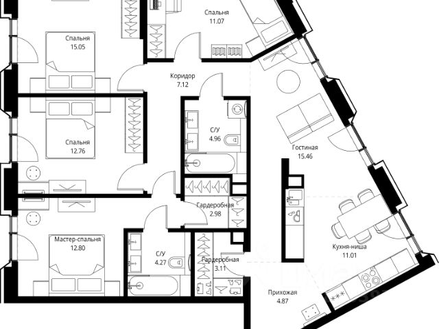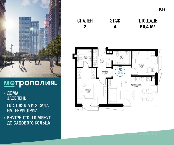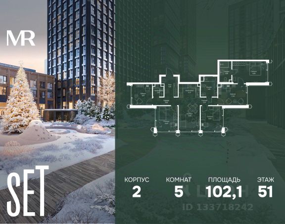 Прямая продажа от застройщика. В ЖК SET продается 5-комнатная квартира площадью 102.10 м², расположенная в корпусе 2, на 51 этаже 59 этажного дома. SET имеет стратегически выгодное расположение в ЗАО, в районе с большой историей и блестящим будущим: между природной зоной долины реки Сетунь и Кутузовским проспектом. В рамках возведения первой очереди предусмотрено три корпуса высотой 18, 45 и 59 этажей. На верхних этажах спроектированы общедоступные смотровые площадки с панорамным обзором на центр столицы. Преимущества проекта: • Функциональные планировочные решения • Контроль проникновения через входную дверь • Система управления освещением и температурой в квартире • Система защиты от протечек с функцией перекрытия воды • Вход в подъезд по биометрическим считывателям Face ID • Скоростные лифты • Двухуровневый подземный охраняемый паркинг на 495 машино-мест Застройка SET включает в себя не только жилые корпуса, но и инфраструктурные объекты. Все необходимое для повседневного комфорта будет расположено в шаговой доступности: • Фитнес-клуб с бассейном • Ведущая городская школа, детский сад и школа искусств • Центр культуры и досуга • Медицинский центр • Кафе и рестораны Расположение комплекса: Пешком: • Метро "Давыдково" - 17 минут • Парк "Долина реки Сетунь" - 3 минуты • Открытие новых станций метро в шаговой доступности в будущем Инфраструктура: Разнообразить свой день резиденты VEER смогут также проводя больше времени на свежем воздухе. Двор разделен на 4 зоны разных эмоций и действий, которые пересечены и соединены веерными прогулочными маршрутами: • Спортивная площадка устроена в глубине ""Кленовой рощи"" • В ""Чайном домике"" будет создан навес с утеплением для отдыха в любую погоду • Площадки для детей воплотятся в ""Волшебный лес"" с цветами, зеркалами и световым дизайном • ""Центральная площадь"" устроена у водного оазиса живописного пруда. " На машине: • "Москва-Сити" - 15 минут • Садовое кольцо - 20 минут • ТЦ "Океания" - 8 минут • ТЦ "Времена года" - 13 минут • Сколково - 12 минут • Гребной канал - 17 минут Компания MR предлагает своим клиентам специальные условия приобретения квартир в рамках программ ипотечного кредитования от банков-партнеров.
