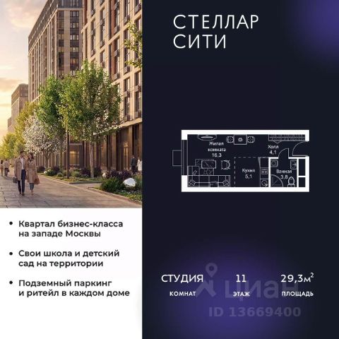 Продается квартира от надежного застройщика Tashir Estate в квартале бизнес-класса Stellar City в ЗАО Москвы. Площадь квартиры составляет: 30.8 кв. м, потолки: 3.1 м Квартира находится на 5 этаже, 4 корпуса жилого квартала Stellar City — микрогорода будущего на орбите Москвы. Stellar City — квартал в ЗАО Москвы вблизи инновационного центра Сколково. В окружении — 11 парков и природных зон, в том числе Долина реки Сетунь, Мещерский лес и парк развлечений The Rink. Город в городе Чтобы дом и инфраструктура вокруг отвечала динамичному лайфстайлу жителя мегаполиса, в основу проекта легла концепция город в городе, которая позволяет решать все бытовые вопросы in-home. В квартале будут возведены школа и детский сад, воркаут-зоны, променад, вело и беговые дорожки, детские площадки для каждого корпуса, а также коммерция на первых этажах для ежедневных покупок. Все необходимое — на расстоянии нескольких шагов. Изящные и лаконичные лобби Авторский дизайн, натуральные материалы в отделке и безупречный интерьер вне времени. Лобби и холлы в проекте бизнес-класса Stellar City ничем не отличаются от входных групп в премиум-сегменте благодаря качественным европейским материалам в отделке, стильному дизайну, консьерж-сервису и уютной зоне ожидания с журнальными столиками и мягкой мебелью. Комфорт и безопасность Закрытая территория, охрана, система СКУД, специально разработанное мобильное приложение дома для резидентов и подземный паркинг с круглосуточным наблюдением и доступом с помощью автоматического считывания номера авто.