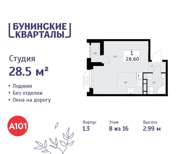 Продается студия 799 в новостройке ЖК "Бунинские кварталы" по адресу Москва, ТиНАО, Новомосковский АО, Сосенское С/П, жилой комплекс Бунинские Кварталы, к1.3, район Коммунарка, Новомосковский административный округ, Москва. Общая площадь квартиры - 28.50 кв. м., этаж 8 из 16, секция 12. Тип проекта, по которому построен дом - монолит, компания-застройщик - ООО "А101". Стоимость квартиры - 12439680 Р. ЖК "Бунинские кварталы" строится на юго-западе Москвы. Монолитные дома в лаконичной стилистике гармонируют с живописной природой. Из любой точки района удобно добираться до природных объектов, ключевых транспортных узлов, крупных торговых, спортивных, деловых и медицинских центров. Концепция уникального благоустройства района - "Выходи гулять!". Здесь появятся эстрада для районных творческих мероприятий, спортивные и игровые площадки, скейт-парк, дружелюбные пространства для домашних питомцев, благоустроенная набережная Ивановского пруда. В районе формируется собственная развитая инфраструктура: современные школа на 1100 мест и 2 детских сада на 540 малышей, магазины у дома и сетевые супермаркеты, фитнес, кафе, салоны, детские развивающие центры. Крытый каток "Самолёт Арена" - в 10 минутах пешком. За 15 минут можно дойти до действующей станции метро "Потапово". Предусмотрены удобные автомобильные выезды на проспект Куприна и улицу Александры Монаховой. Особенности "Бунинских кварталов": - ст. метро "Потапово" - 15 минут пешком - своя школа и детские сады - безопасные дворы без машин с системой контроля доступа - насыщенная инфраструктура - в шаговой доступности и на первых этажах домов