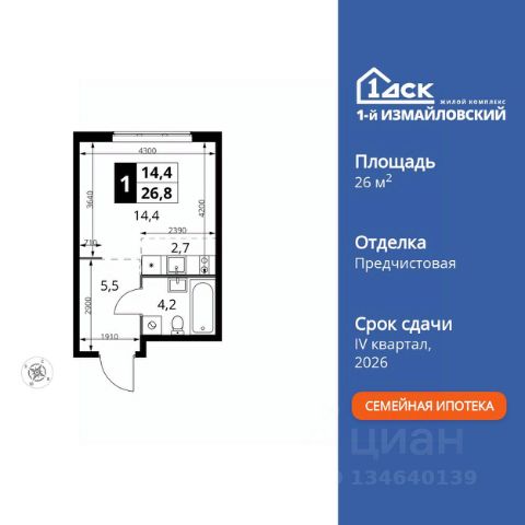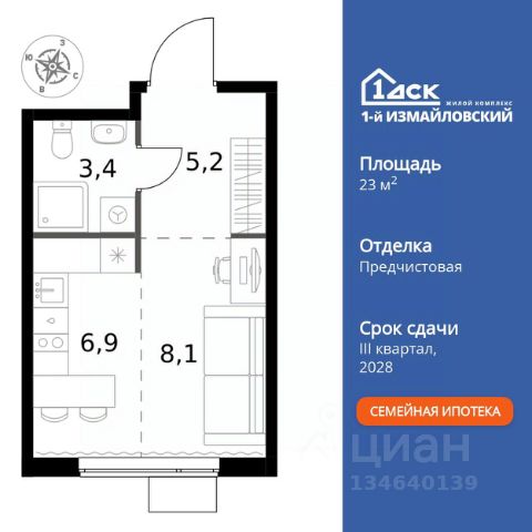 Просторная студия для молодой семьи. Общая площадь - 23.2м2, удобная планировка, кухня 5м2. Панорамные виды из окон на две стороны - на национальный парк "Лосиный остров" и благоустроенный внутренний двор. Условия покупки: - Скидка при полной оплате - 10% - Ипотека от 3,5% на весь срок или 0,11% на первый год - Рассрочка без процентов - Trade-in с проживанием на время строительства дома НАЗАРЕ - шесть домов бизнес-класса высотой 24-43 этажа. Проект расположен рядом с национальным парком "Лосиный остров" и парком "Сокольники". В продаже квартиры с мастер-спальнями, кухнями-гостиными, открытыми террасами, просторными кладовыми и ванными с окном. Форматы - от светлых студий 21,6 м2 до семейных 4-комнатных 125,5 м2. Часть лотов - с предчистовой отделкой White Box. Транспортная доступность: - Метро "Бульвар Рокоссовского" и МЦК - 2 мин. пешком - Северо-Восточная хорда - 3 мин. на автомобиле - Третье транспортное кольцо - 15 мин. на автомобиле - Садовое кольцо - 18 мин. на автомобиле Инфраструктура: В составе проекта появится собственный детский сад и торгово-развлекательный центр с акцентом на шопинг и досуг. На первых этажах домов откроются кафе, пекарни, магазины и службы сервиса. В районе Богородское находятся престижные школы, медцентры, магазины и спортивные клубы.