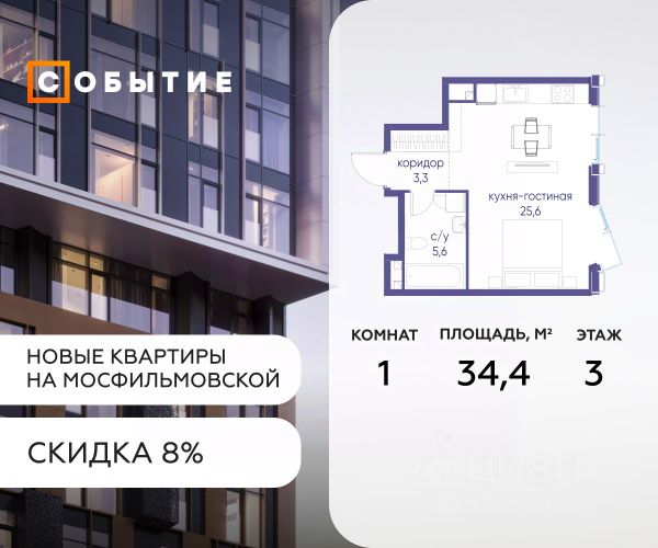 Цена указана с учётом скидки при 100%-й оплате, несубсидированной ипотеке, рассрочке (кроме программы "Рассрочка 0%"). В жилом квартале, расположенном на границе с природным заказником "Долина реки Очаковки", продаётся студия площадью 22.20 кв.м без отделки. Квартира расположена на 22 этаже 42-этажного корпуса 2 в жилом комплексе бизнес-класса Левел Мичуринский (компания Level Group/Левел групп). Отличная транспортная доступность: - от 10 мин. пешком до станции метро "Мичуринский проспект" - 15 мин. пешком до станции метро "Аминьевская" - 7 мин. на авто до МКАД - 10 мин. на авто до ТТК - 15 мин. на авто до Москва-Сити Продуманный архитектурный проект: - Выразительная архитектура от известных бюро: корпуса 1-6 - СПИЧ, корпуса 7-13 - Borisov Architects; - Из окон открываются живописные виды на парки, Москва-Сити и МГУ; - Высокие потолки до 6,35 м; - Стильные лобби с окнами в пол и высокими потолками до 4,7 м; - С каждого этажа дома на лифте можно спуститься в подземный отапливаемый паркинг. Расположение: Жилой комплекс Левел Мичуринский строится в одном из самых зелёных районов Москвы - Очаково-Матвеевское. Этот уголок столицы идеален для поддержания здорового образа жизни. В шаговой доступности от проекта находятся заказник "Долина реки Очаковки" - 1 мин. пешком и Очаковский парк - 7 мин. пешком. На велосипеде можно добраться до таких парков, как "Событие", парк Олимпийской деревни, парк 50-летия Октября и парк Школьников. В 15 минутах езды на авто расположено более 30 детских садов (из них 14 в пешей доступности), 32 школы (из них 13 в пешей доступности) и 14 вузов. Также в ближайшем окружении - более 25 медицинских учреждений, 11 спортивных клубов и 22 продуктовых супермаркета. Внутренняя инфраструктура: На территории жилого комплекса строится три детских сада и школа. На первых этажах домов откроется супермаркет, фитнес-центр, ресторан, кафе и другие сервисы. Подземные этажи займут паркинги: трёхуровневые - в этапах 1 и 2, одноуровневый - в этапах 3 и 4. Преимущества проекта: - 4,5 га благоустроенной территории с видовым мостом, уличным кинотеатром, зонами для тихого отдыха, работы, воркаута, площадки для петанка, футбола, настольного тенниса и пляжного волейбола. - Дизайнерские лобби с панорамным видом на двор, мойками для лап животных и комфортными зонами ожидания. - Безопасность жителей: круглосуточное видеонаблюдение всех зон общего пользования (лобби, лифты, паркинги, детские площадки), система контроля доступа, управление видеодомофоном через мобильное приложение, единый ключ доступа на территорию жилого комплекса. - Технологии и комфорт: высокоскоростной Wi-Fi в лобби и на придомовой территории, автоматическая система контроля и учёта ресурсов, абонентская связь с консьержем, распознавание номеров автомобилей при въезде в паркинг и выезде из него.