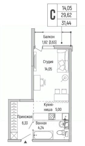 Продаётся студия 305, площадью 26,18 м², на 7 этаже в ЖК "Аникеевский" корпус 1.2. Стоимость — от 5686314 руб. Квартира без отделки, планировка односторонняя, окна во двор.