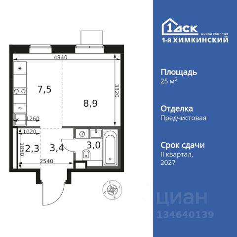 Прямая продажа от застройщика! Жилой Комплекс класса Комфорт. Продаётся квартира-студия номер 215 общей площадью 23.2 кв.м. на 6-м этаже 16 этажного здания. Без отделки. Особенности квартиры: - Линейная планировка - максимальная функциональность и удобство. - Ниша под шкаф - компактное и удобное место для вещей. Информация о комплексе: Квартал класса комфорт плюс, где современное городское пространство граничит с удивительной природой вокруг. 1-й Химкинский расположен на территории в 102 га и органично вписан в природное окружение Химкинского леса и канала им. Москвы. В проекте предусмотрена богатая коммерческая инфраструктура с собственным торговым центром, общеобразовательные учреждения и социальные объекты. Изюминкой жилого комплекса будут спортивно-оздоровительный комплекс с термами и SPA и семейный парк развлечений. Транспортная доступность: ЖК "1-й Химкинский" дает возможность выбрать любой способ передвижения как до города, так и до самых разных объектов, которые могут представлять интерес для его жителей. Не важно, какой способ передвижения вы предпочитаете, успевать всегда и везде можно вне зависимости от выбора транспорта. - 8 мин. пешком (800 м) до остановки "Золотая Арка" -10 мин пешком (1 км) до остановки "Поворот на Ивакино" Внутренняя инфраструктура: - Безопасность: закрытые дворы без машин, безбарьерная среда и сквозные подъезды, камеры на детских площадках с возможностью трансляции на смартфоне - Идеальный отдых в кругу семьи: семейный парк развлечений на территории, торговый центр (2-х этажный) общей площадью более 8 тыс. кв. м с фудкортом - Образование: 3 детских сада и современная муниципальная школа на 2450 мест - Спортивная среда: закольцованный веломаршрут с навигацией, спортивный комплекс с термами, закрытый тренажерный зал и зоны ворк-аута - Социальные объекты: поликлиника со станцией скорой помощи, пожарное депо - Подземный паркинг и кладовые помещения на -1 этаже, станция техобслуживания и автомойка на территории