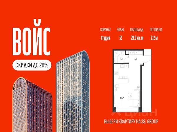 Ипотека от 3,5% на весь срок. Дополнительная скидка в офисе продаж! Продается уютная студия площадью 22,3 кв.м на 24 этаже жилого комплекса бизнес-класса Войс. Общая площадь: 22,3 кв.м., жилая: 12,8 кв.м., площадь кухни-гостиной: 16,2 кв.м., высокие потолки: 3,12 м., санузел совмещенный. О проекте: Войс. Высокие стандарты жизни Мы уверены, что высокие идеалы неизменно помогают достигать высот. Создавая Войс, мы ориентировались на людей с высокими требованиями к качеству и безупречным вкусом. Башни жилого комплекса, сочетают элегантную форму с динамичной геометрией фасадов, устремляются ввысь и отвечают самым высоким стандартам строительства. Технологичность, воплощенная в архитектуре - это ваш, собственный Войс. Преимущества локации Близость к метро Текстильщики, БКЛ и МЦК Новохохловская (10 мин) Рядом природный заповедник и конно-спортивная база Кузьминки-Люблино Будущее окружение Проект Южный порт - Текстильщики с деловым центром Сити-2 Небоскребы высотой до 300м Культурный центр с амфитеатром Променад вдоль Москвы-реки и яхт-клуб Архитектура Проект от Архитектурной мастерской Алексея Ильина Две перпендикулярные башни с арочными вершинами Высокая башня: светло-серый металл Низкая башня: терракотовая керамика Благоустройство Внешняя зона: парковки, магазины, кафе Внутренний двор: закрытая территория с озеленением Шумозащитный экран Сезонное озеленение Встречи на высоте Гранд-лобби высотой 8м Дизайнерская мебель Умные скоростные лифты Услуги Детский центр с игровой зоной Фитнес-студия для жителей