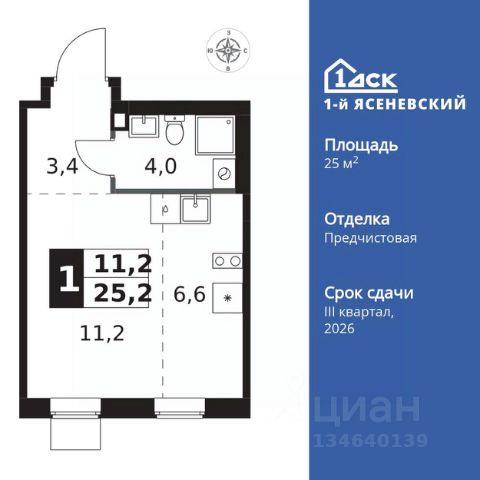 Прямая продажа от застройщика! Жилой Комплекс класса Комфорт Плюс. Продаётся квартира-студия номер 757 общей площадью 26.4 кв.м. на 4-м этаже 16 этажного здания. Без отделки. Особенности квартиры: - Квартиры рядом с метро - м. Корниловская 9 мин пешком - 63 га лесопарка за окнами - Школа c it-кластером и бассейном. 2 детских сада - Линейная планировка - максимальная функциональность и удобство. - Можно оборудовать рабочее место - комфорт для работы и учёбы. - Ниша под шкаф - компактное и удобное место для вещей. Информация о комплексе: В жилом комплексе комфорт-плюс класса "1-го Ясеневского" доступны преимущества двух стилей жизни. Ведь в пешей доступности метро, школа с 25-метровым бассейном и IT-кластером и при этом целых 63 га благоустроенного Троицкого лесопарка под окнами, где так приятно дышать свежим воздухом и слушать пение птиц. Собственная закрытая территория "1-го Ясеневского" представляет собой уютный оазис. Здесь и зеленый освещенный бульвар для прогулок, система велодорожек, маленькая городская площадь, кафе, пекарни и кофе поинты. А еще дворы без машин и многоэтажная парковка. Изюминка территории - фруктовые деревья во дворах и городские сады. "1-й Ясеневский" - всего в 1 км от МКАД, на территории новой Москвы. Жилой комплекс, где есть все необходимое для современного человека. Транспортная доступность: До метро "Корниловская" - 12 минут пешком До метро "Тютчевская" - 25 минут пешком До метро "Теплый стан" - 10 минут на транспорте До метро "Ольховая" - 30 минут на общественном транспорте Личный автотранспорт: Выезд на Калужское шоссе - 500 м МКАД - 1 км Внутренняя инфраструктура: ЖК "1-й Ясеневский" можно назвать идеальным местом для жизни семьи с детьми. Здесь буквально за домом находится Троицкий лесопарк - излюбленное место прогулок молодых родителей. А во внутренних дворах под детские площадки выделены специальные зоны. Они оборудованы всем, что нужно для счастливого детства: современными и максимально безопасными качелями, песочницами и лазалками. Оборудование и игровые сценарии на детских площадках спроектированы вместе с командой детских психологов для правильного развития ребенка и для повышения их интереса. Также рядом с домом два детских садика, один из которых уже построен и школа на 1100 мест. Школу по праву можно назвать образцовым учебным заведением. В ней закладываются основы успешного будущего. Здесь есть класс робототехники, IT-кластер, 25-метровый бассейн и прекрасно оборудованные спортзалы.