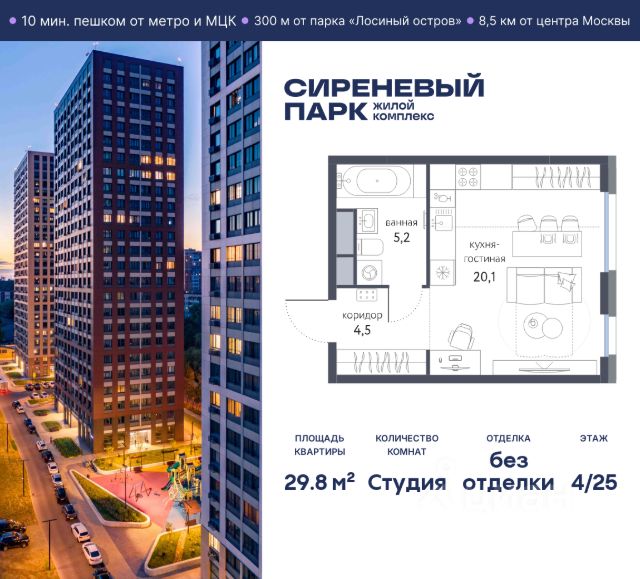 Продаётся просторная студия общей площадью 23.8 м² на 25 этаже в новом жилом комплексе "Сиреневый парк", расположенном в Восточном административном округе Москвы на улице Тагильская. Всего 10 минут ходьбы от станции метро "Бульвар Рокоссовского" и одноимённой платформы МЦК. Высококачественное монолитное строительство гарантирует сохранение тепла в доме, а наличие квартир с предчистовой и чистовой отделкой позволяет вам сэкономить время и сразу же переехать в свое жилье после покупки. Благодаря разнообразию планировок вы сможете выбрать идеальный вариант, соответствующий вашим предпочтениям и образу жизни. Предлагаются квартиры: - с просторными кухнями-гостиными, - с нишами для хранения вещей и отдельными гардеробными, - мастер-спальни с собственными санузлами, - большие комнаты с высокими потолками (2,9 м) и с увеличенными безопасными окнами (1,95 м) , которые наполнят ваш дом естественным светом; - с чистовой отделкой по двум дизайн-проектам на выбор; - с остекленными лоджиями и панорамными видами на лес. Каждая деталь в этом доме создана для вашего комфорта: - безбарьерная среда, - бесшумные скоростные лифты, - машиноместа в отапливаемом подземном паркинге и кладовые на -1 этаже с доступом из лифта, - развитая инфраструктура с супермаркетами, кафе, фитнес-клубами, салонами красоты и частным детским садом обеспечивает максимальное удобство жителям. В 300 метрах от ЖК расположен Национальный парк "Лосиный остров". Способы покупки: 100%, Рассрочка 0% от застройщика, Trade-in, Семейная ипотека без наценки, стандартная ипотека. Запишитесь на просмотр в офис продаж и получите свою персональную скидку по акции Назови свою скидку. ЖК "Сиреневый парк" — гармония в деталях, совершенство в каждом моменте. Застройщик проекта - AFI Development.