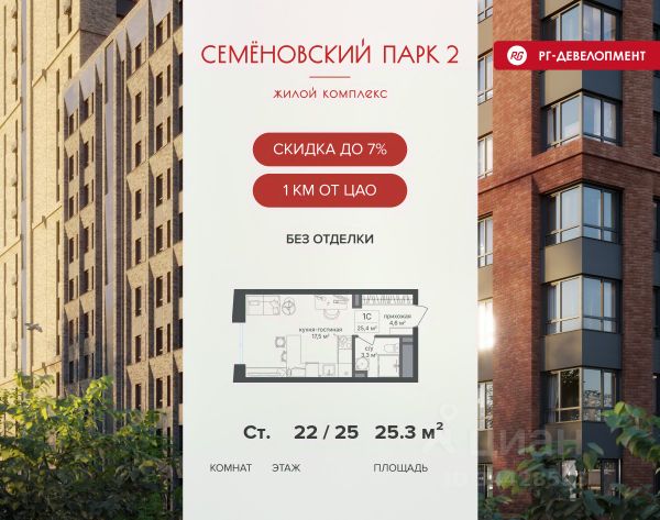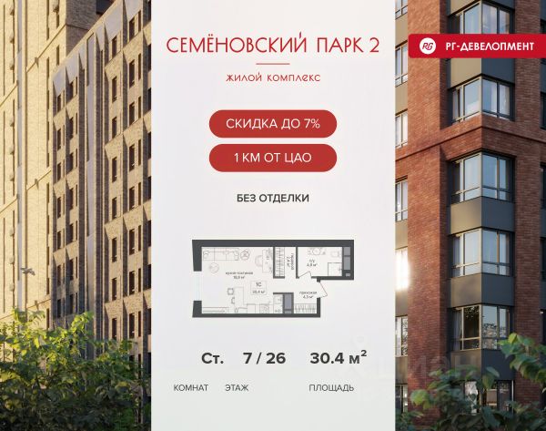 Ипотека для каждого! Полная стоимость кредита от 12,380% до 18,537%. Ставка от 0,11% в АО "Альфа-Банк", ген. лицензия ЦБ РФ 1326 от 16.01.2015. Ставка фиксируется на первые 12 месяцев, далее полная стоимость кредита от 22,022% до 24,599% ставка 21,59%. Первоначальный взнос — от 20,1% от стоимости квартиры. Срок кредитования — от 4 до 30 лет. Ипотека на весь срок! Полная стоимость кредита от 23,396% до 26,058% со ставкой 14,5%! Первоначальный взнос —от 20,01% от стоимости квартиры. Срок кредитования — от 3 до 30 лет. АО "Банк ДОМ.РФ" универсальная лицензия Банка России 2312 от 19.12.2018. Скидка 7% при покупке квартиры! Цена указана с учетом максимального размера скидки. Продается студия 23,7 кв.м. в ЖК "Семеновский парк 2" на 13-м этаже 26 этажного дома. Компания "РГ-Девелопмент" предоставляет скидку на квартиры в жилом комплексе. Акция действительна до 31.03.2026 включительно. Чтобы воспользоваться предложением, необходимо подписать договор на приобретение недвижимости до 31.03.2026 включительно. Компания "РГ-Девелопмент" вошла в ТОП-10 девелоперов по объёму введённого жилья в "Старой Москве" по итогам 2025 года. Прямая продажа от застройщика! Квартиры без отделки. Срок сдачи корпуса - 1 кв. 2026 г., корпус сдан. Выдача ключей. ЖК "Семеновский парк 2" - это идеальное место для того, чтобы стать вашим домом. Проект расположен в исторической части Москвы вблизи Измайловского лесопарка, в 1 км от ЦАО. 4 станции метро отделяют вас от Красной площади и 15 минут на автомобиле - от Садового кольца.