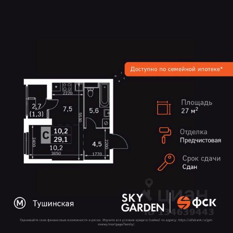 Прямая продажа от застройщика! Жилой Комплекс бизнес-класса. Продаётся квартира-студия номер 664 общей площадью 34.9 кв.м. на 7-м этаже 43 этажного здания. Предчистовая отделка. Цена с учётом скидки. Особенности квартиры: - Организуем показ в удобное для вас время! - Просторная спальня, в которой можно разместить большую кровать. - Линейная планировка - максимальная функциональность и удобство. - Увеличенное количество окон - дополнительное освещение и свежий воздух. - Гибкая планировка - создайте пространство по своему вкусу. - Можно оборудовать рабочее место - комфорт для работы и учёбы. - Можно сделать распашные двери - удобный доступ и стильный акцент. - Линейная кухня - функциональность и практичность в одном решении. - Ниша под шкаф - компактное и удобное место для вещей. - Лоджия - уютное место для отдыха и тишины. Квартира с предчистовой отделкой. Вам не придется заниматься черновыми и трудоёмкими работы, а чистовую отделку и дизайн - сделайте на свой вкус. Информация о комплексе: ЖК "Скай Гарден" в Покровском-Стрешнево: гармония природы и мегаполиса. Живите среди зелени одноимённого парка, рек и каналов с чистым воздухом, сохраняя все преимущества городской инфраструктуры. Идеальный баланс для тех, кто ценит природу без компромиссов в комфорте. Транспортная доступность: Всего в 12 минутах пешком до м. Тушинская и 15 минутах до станции Тушинская МЦД. На автомобиле: 2 км до Волоколамского шоссе, 2,5 км до МКАД и 15 км до Садового кольца Внутренняя инфраструктура: К вашим услугам игровые площадки для детей с горками и фонтанами. Йога на газоне, воркаут, велопарковки. На территории: поликлиника, аптека, супермаркет, зоны отдыха. Игровая комната в лобби, хранилище для велосипедов в подъездах. Рядом: кафе, пекарня, мастерские, секции. Парк 3,5 га с набережной для прогулок. Всё для жизни и спорта в шаговой доступности. Квартира с предчистовой отделкой - ваш дизайн без черновых работ
