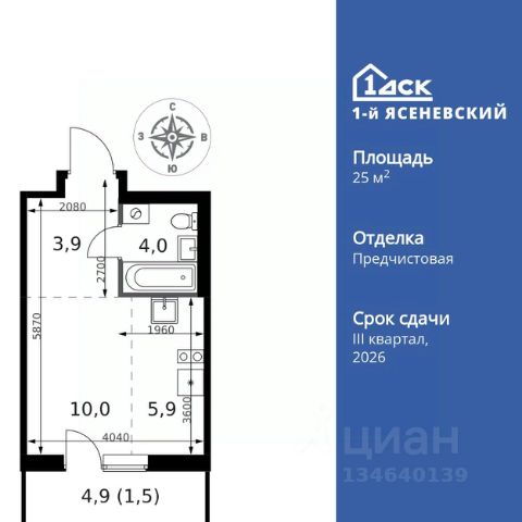 Прямая продажа от застройщика! Жилой Комплекс класса Комфорт Плюс. Продаётся квартира-студия номер 810 общей площадью 25.3 кв.м. на 2-м этаже 5 этажного здания. Предчистовая отделка. Цена с учётом скидки. Особенности квартиры: - Квартиры рядом с метро - м. Корниловская 9 мин пешком - 63 га лесопарка за окнами - Школа c ИТ-кластером и бассейном. 2 детских сада - Организуем показ в удобное для вас время! - Линейная планировка - максимальная функциональность и удобство. - Большой балкон - больше пространства для вашего отдыха. - Панорамное остекление балкона - наслаждайтесь видами из вашего балкона. Квартира с предчистовой отделкой. Вам не придется заниматься черновыми и трудоёмкими работы, а чистовую отделку и дизайн - сделайте на свой вкус. Информация о комплексе: ЖК "1-й Ясеневский": преимущества городской инфраструктуры и природы. Пешая доступность к метро, школе с бассейном и ИТ-кластеру, а также 63 га Троицкого лесопарка под окнами. Закрытая территория с бульварами, велодорожками, кафе и дворами без машин. Фруктовые деревья и городские сады создают уникальную атмосферу. Всего в 1 км от МКАД - идеальный баланс для современной жизни. Транспортная доступность: До метро "Корниловская" - 12 минут пешком До метро "Тютчевская" - 25 минут пешком До метро "Теплый стан" - 10 минут на транспорте До метро "Ольховая" - 30 минут на общественном транспорте Личный автотранспорт: Выезд на Калужское шоссе - 500 м МКАД - 1 км Внутренняя инфраструктура: ЖК "1-й Ясеневский" - идеальное место для семей с детьми. Рядом Троицкий лесопарк для прогулок, а во дворах - современные детские площадки, разработанные с участием психологов. В шаговой доступности два детских сада и школа на 1100 мест с ИТ-кластером, бассейном и классами робототехники. Всё для счастливого детства и успешного будущего. Квартира с предчистовой отделкой - ваш дизайн без черновых работ