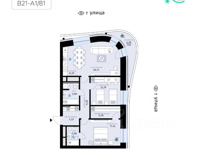 В продаже — квартира-студия с чистовой отделкой, общей площадью 74,36 кв. м. Квартира расположена на первом этаже шестиэтажной секции корпуса класса Суперб в новом районе СберСити, который строит Сбер. Дом находится на первой береговой линии Москвы-реки. Сочетание элегантной архитектуры от ведущего итальянского бюро и передовых технологий на всех уровнях — от квартиры до инфраструктуры района. Дом возводится по технологии монолитного строительства. Отделка фасадов выполнена из природного камня, глазурованной плитки и алюминия. Проведены работы по улучшению шумоизоляции, установлены двухкамерные стеклопакеты с низкоэмиссионными стёклами, минимизирующими теплопотери. В санузлах установлен тёплый пол, высота потолков в квартире 3,6 м. В квартирах предустановлена система "умный дом" — комплекс решений, объединяющий квартиру, дом и прилегающую территорию. Жильцы могут регулировать климат и освещение голосом или со смартфона, выбирая комфортные сценарии для жизни. В доме расположены: • круглосуточный консьерж-сервис, • общественная гостиная, • уютное лобби, • общественная терраса, • коворкинг для жителей, • собственная спортивная студия, • колясочная и велосипедная комната на первом этаже, • детская игровая комната, • лапомойка, • подземный паркинг. СберСити — это новый жилой и деловой район на западе Москвы, в одном из самых экологически чистых и престижных мест столицы. Это первая в России и крупнейшая в мире инновационная городская среда, созданная по международным стандартам зелёного проектирования. Здесь внедряются решения в области энергоснабжения, вакуумного мусороудаления, тестирования зелёных технологий, а в дальнейшем — системы искусственного интеллекта для управления домами и городской инфраструктурой. Строительство проекта началось в 2021 году, заселение первых корпусов — с лета 2024-го. Общая площадь территории — 461 га, из них более 2,5 млн кв. м жилья и около 833 тыс. кв. м офисных пространств. Будет построено 7 школ, 13 детских садов и 2 поликлиники. В СберСити будут жить 65 тыс. человек и работать 70 тыс. Развитием территории занимается АО "Рублёво-Архангельское", входящее в группу Сбер. СберСити — место, где хочется жить, работать и растить детей. Переезжайте в СберСити!