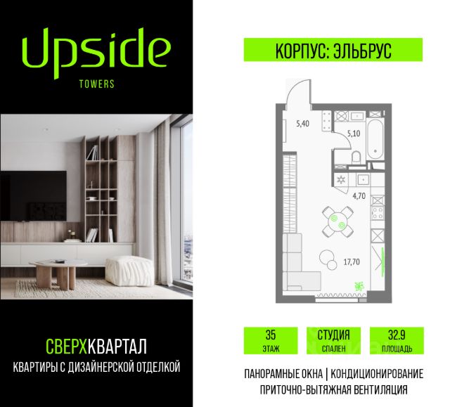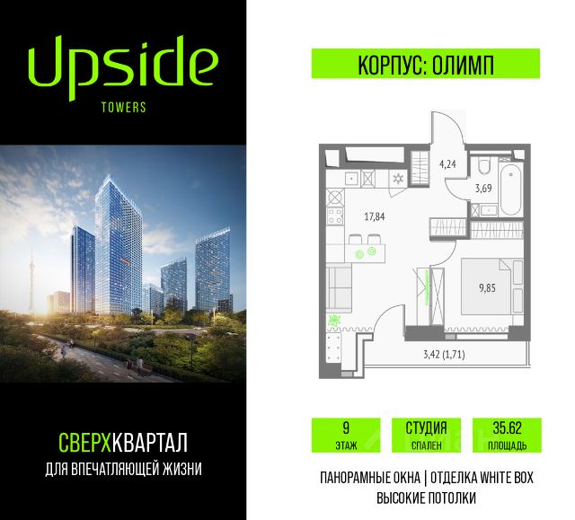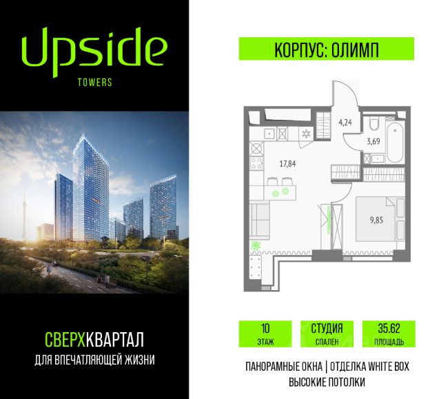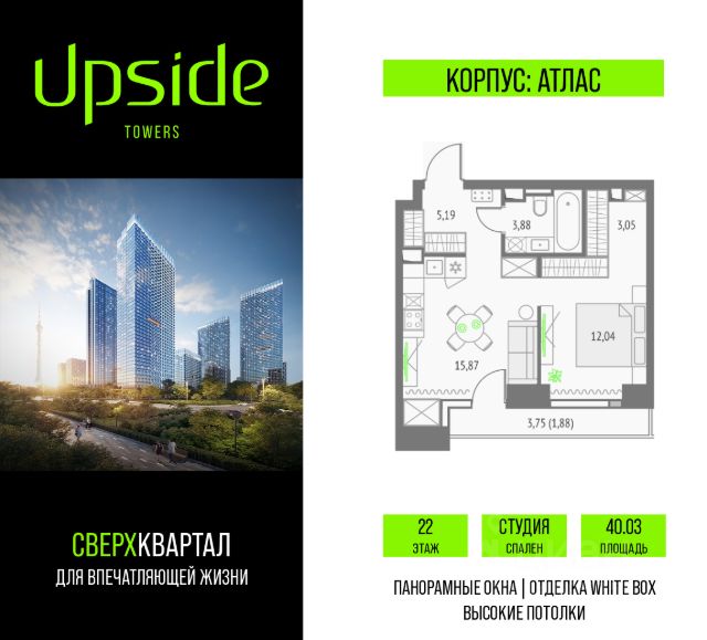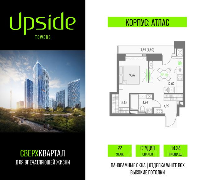 Квартира-студия с эргономичной планировкой. Панорамное остекление с французским балконом и видом на центр города. Окна выходят на Западную сторону света. "Достижение" - единственный дом с торжественной архитектурой в окружении бескрайних парков на любой вкус: парк "Дубовая роща", обновленный классический парк "Останкино", самый известный парк России ВДНХ и крупнейший в Европе ботанический сад. Дом находится в непосредственной близости от центра города: до Садового кольца на автомобиле - 15 минут, 700 м до станции метро "Бутырская", а от нее всего 3 станции на метро - и вы на Цветном бульваре. Архитектура проекта - современное прочтение торжественного и изящного стиля ар-деко, который, как и сталинский ампир, сформировался в результате развития идей чикагской школы. В доме 6 секций, 115 вариантов продуманных планировочных решений - от уютных студий до просторных пентхаусов с дровяным камином. В каждой квартире предусмотрен полный комплекс систем комфорта: принудительная центральная вентиляция с фильтрацией воздуха, очистка воды до уровня питьевой, круглогодичное горячее водоснабжение, быстрые бесшумные лифты, которые идут прямо в паркинг, продуманная подготовка под кондиционирование и другие технологические решения. В доме "Достижение" общественные пространства и квартира тоже гармонично дополняют друг друга, как части единого целого. Здесь есть инфраструктурный центр Clubhouse только для жителей, открывающий возможности для общения и детского развития: клубная гостиная жителей по стандарту Friend`s Lab и детская игровая комната 250 кв.м. в концепции Kid`s Lab. На площади 1,7 гектара создан живописный парк с террасным склоном, в котором растут луговые травы, кустарники и деревья. Пространство ландшафтного парка разделено на зоны для активного и спокойного отдыха с зелёными уголками для любителей тишины. Для спокойного отдыха: тихие места с беседками и шезлонгами, клубная гостиная в концепции Friend`s Lab с открытой террасой и гамаками, зона для барбекю, смотровая галерея, уютный пруд, а также пять пеших маршрутов для променада. Для активного отдыха: универсальная многофункциональная спортивная площадка, отдельная зона для занятий workout и бесплатный фитнес-зал только для жителей по стандарту Fit Lab. В центральной части парка расположен амфитеатр со сценой для представлений и проведения мероприятий. Для гармоничного развития маленьких жителей - пространства по стандарту Kid`s Lab для гармоничного развития детей всех возрастов: детская площадка, игровая комната, рельефная площадка для общения со сверстниками, где можно заниматься паркуром, танцевать и играть в настольный теннис.