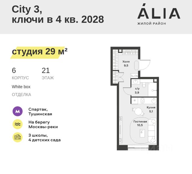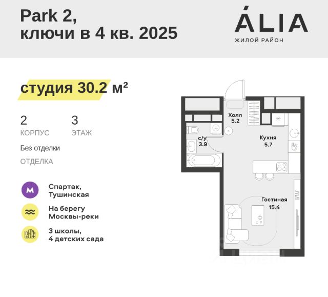 Продаётся Студия 30.2 м². В жилом районе Алиа на 3-м этаже 11-этажного дома. Жилой район Алиа — это дома бизнес-класса у слияния Москвы-реки и Сходни. Алиа находится в Покровском-Стрешневе, экологически чистом районе на престижном северо-западе столицы. Район возводится на бывшей территории Тушинского аэрополя, где никогда не было промышленного производства. Алиа — это район разностороннего развития, спроектированный по принципу WORK.LIVE.PLAY.LEARN. Это "15-минутный город", где вся необходимая для комфортной жизни инфраструктура — на расстоянии приятной прогулки. У района удобное расположение: отсюда меньше 10 минут пешком до станций метро "Спартак" и "Тушинская" и всего полчаса на автомобиле до центра города или аэропорта Шереметьево. Архитектурную концепцию Алиа разработало бюро SOM (Skidmore, Owings & Merrill), авторы знаменитой "Бурдж-Халифа". В Алиа больше 140 планировочных решений, среди которых — редкие для Москвы форматы: квартиры с окном в ванной, пентхаус, сити-юниты и таунхаусы. Почти половина территории района отдана под благоустройство. В Алиа три парка: Линейный парк с кафе и магазинами, Центральный парк с амфитеатром, сухим фонтаном и большим плейхабом для детей всех возрастов и Прибрежный парк на собственной набережной, одной из самых длинных в Москве. В каждом урбан-блоке — закрытый внутренний двор с гипоаллергенными растениями и детской площадкой. В лобби каждого жилого корпуса в Алиа оборудована зона ожидания, колясочная, гостевой санузел и лапомойка для домашних животных. За стойкой ресепшена резидентов и их гостей встречает консьерж. Центральное лобби урбан-блока — это стильное общественное пространство с коворкингом, лаундж-зоной и кофе-пойнтом. Это "вторая гостиная" жителей урбан-блока и одно из мест, где формируется комьюнити Алиа. Два ключевых объекта инфраструктуры в Алиа — это спорткомплекс "Чкалов Арена", где представлены 25 видов спорта, и самый большой в стране бизнес-парк класса A, благодаря которому району обеспечено быстрое развитие.