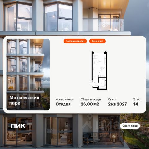 О квартире Продаётся студия общей площадью 24.6 кв.м. с отделкой white box. Квартира расположена на 5 этаже корпуса 5.2 в жилом комплексе бизнес-класса "Среда на Лобачевского" в пешей доступности от метро "Аминьевская". О жилом комплексе "Среда на Лобачевского" полностью соответствует критериям современного жилого пространства. Взяв за основу рациональный подход, мы гармонично соединили дизайн, актуальные тренды и функциональность. Продуманный современный экстерьер и функциональные планировки внутри, приватные пространства и разнообразные досуговые зоны для каждого члена семьи — все это "Среда на Лобачевского". Инфраструктура Район отлично развит и наполнен жизнью, здесь уже есть вся необходимая инфраструктура — детские сады, школы, медучреждения, торговые центры, благоустроены парки для прогулок и отдыха, удобен и легкодоступен городской транспорт. Рядом расположены учебные корпуса крупных университетов — МГУ, МГИМО и РАНХиГС. Школы и детские сады в районе занимают высокие позиции в городских рейтингах, поэтому вам не придется беспокоиться о качестве образования детей. Как и об отдыхе: поблизости расположены живописные пруды, реки и парки. Это Парк Олимпийской деревни, Парк имени 50-летия Октября, Мещерский парк и Очаковские пруды. Теперь поставить галочки в еженедельном чек-листе "спорт-прогулки-встречи с друзьями" можно, не покидая любимый район. Особенности Особое внимание в проекте уделяется созданию функциональных пространств не только внутри дома, но и за его пределами. В ландшафтном парке "Среды на Лобачевского" расположены крытые зоны для спокойного времяпровождения, места для активного отдыха и спорта, коворкинг, соседский комьюнити-центр, водные объекты. —Ландшафтный парк во дворе. —Водный сад с зонами отдыха. —Зоны коворкинга. —Дизайнерские гранд-лобби. —Бесключевой доступ. —Подземный паркинг.