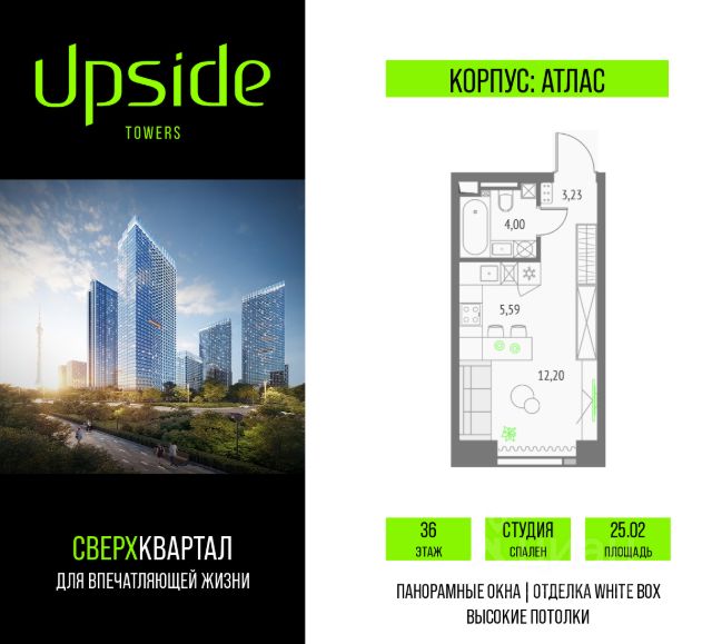 Продаётся студия площадью 33.39 кв.м на 3 этаже 19 этажного корпуса Олимп в квартале небоскребов "Upside Towers". В квартире отделка White-box, c видом на корпус Атлас, корпус Эльбрус, Гранд-плаза,. Номер квартиры В0301. Upside Towers - технологичный квартал строится в динамично развивающемся Бутырском районе, в 3 мин. от метро, в 5 мин. от ТТК. На территории 7 га возводится 5 высотных башен от 19 до 58 этажей, названных в честь главных вершин земли. Квартиры с панорамными окнами в пол, высокими потолками и современными инженерными решениями. Благоустроенная зеленая территория включает: приватные дворы, природный комплекс, прогулочный бульвар, ландшафтный парк 2,5 га с сенсорным садом и многофункциональными игровыми и спортивными площадками. В корпусе откроются магазины, кафе и рестораны, а также другие объекты коммерческой инфраструктуры. Большое внимание в проекте уделяется созданию социальной инфраструктуры. Между "Атласом" и "Олимпом" в трехэтажном стилобате разместится уникальное пространство закрытый клуб для жителей квартала Upside Club площадью 2 000 кв. м. Здесь разместятся: каминный зал с роялем, многофункциональная детская зона c двухуровневым игровым оборудованием для малышей и дошкольников, плей-рум для подростков, домашний кинотеатр, коворкинг, переговорные и лектории. На 47 этаже башни "Атлас" откроется SKY SPA Relax с расслабляющей атмосферой, джакузи, сауной, залами для релаксации и йоги. Собственники квартир смогут в любое удобное для них время забронировать посещение спа-зоны через смарт-приложение. На крыше стилобата разместится всесезонная BBQ патио-зона с верандой и закрытыми помещениями для приготовления и отдыха. В башнях откроются смотровые террасы для резидентов с панорамными видами на город, парки, Останкинскую башню, ВДНХ, Ботанический сад и Москву-Сити. Покупая квартиру даже самого минимального размера в Upside Towers, вы получаете в пользование 2 000 м² бесплатных общественных пространств. В рамках проекта строится государственная школа и детский сад, разместится более 15 000 кв.м. коммерческой инфраструктуры. Насыщенная социальная инфраструктура формирует множество сценариев для жизни на территории квартала. В Upside Towers применяются лучшие технологии и практики, чтобы обеспечить высшее качество жизни: Воздух, не уступающий по качеству горному, обеспечит приточно-вытяжная вентиляция. Пятиступенчатая очистка воды с сохранением полезных минералов. Центральное кондиционирование. Внутрипольные конвекторы с естественной конвекцией. Современные системы безопасности и мониторинга микроклимата. Высокоскоростной интернет на всей территории, в квартирах и паркинге за счет усиления GSM-связи всех ведущих операторов. Все места в подземном паркинге оборудованы зарядками для электрокаров. Бутырский район непрерывно развивается и готовится стать новым современным деловым районом Москвы. В рамках программы "Индустриальные кварталы" комплексного развития территории Огородного проезда будут построены современные обра