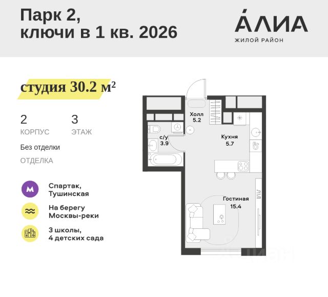 Продаётся Студия 22.4 м². В жилом районе Алиа на 12-м этаже 28-этажного дома. Жилой район Алиа — это дома бизнес-класса у слияния Москвы-реки и Сходни. Алиа находится в Покровском-Стрешневе, экологически чистом районе на престижном северо-западе столицы. Район возводится на бывшей территории Тушинского аэрополя, где никогда не было промышленного производства. Алиа — это район разностороннего развития, спроектированный по принципу WORK.LIVE.PLAY.LEARN. Это "15-минутный город", где вся необходимая для комфортной жизни инфраструктура — на расстоянии приятной прогулки. У района удобное расположение: отсюда меньше 10 минут пешком до станций метро "Спартак" и "Тушинская" и всего полчаса на автомобиле до центра города или аэропорта Шереметьево. Архитектурную концепцию Алиа разработало бюро SOM (Skidmore, Owings & Merrill), авторы знаменитой "Бурдж-Халифа". В Алиа больше 140 планировочных решений, среди которых — редкие для Москвы форматы: квартиры с окном в ванной, пентхаус, сити-юниты и таунхаусы. Почти половина территории района отдана под благоустройство. В Алиа три парка: Линейный парк с кафе и магазинами, Центральный парк с амфитеатром, сухим фонтаном и большим плейхабом для детей всех возрастов и Прибрежный парк на собственной набережной, одной из самых длинных в Москве. В каждом урбан-блоке — закрытый внутренний двор с гипоаллергенными растениями и детской площадкой. В лобби каждого жилого корпуса в Алиа оборудована зона ожидания, колясочная, гостевой санузел и лапомойка для домашних животных. За стойкой ресепшена резидентов и их гостей встречает консьерж. Центральное лобби урбан-блока — это стильное общественное пространство с коворкингом, лаундж-зоной и кофе-пойнтом. Это "вторая гостиная" жителей урбан-блока и одно из мест, где формируется комьюнити Алиа. Два ключевых объекта инфраструктуры в Алиа — это спорткомплекс "Чкалов Арена", где представлены 25 видов спорта, и самый большой в стране бизнес-парк класса A, благодаря которому району обеспечено быстрое развитие.