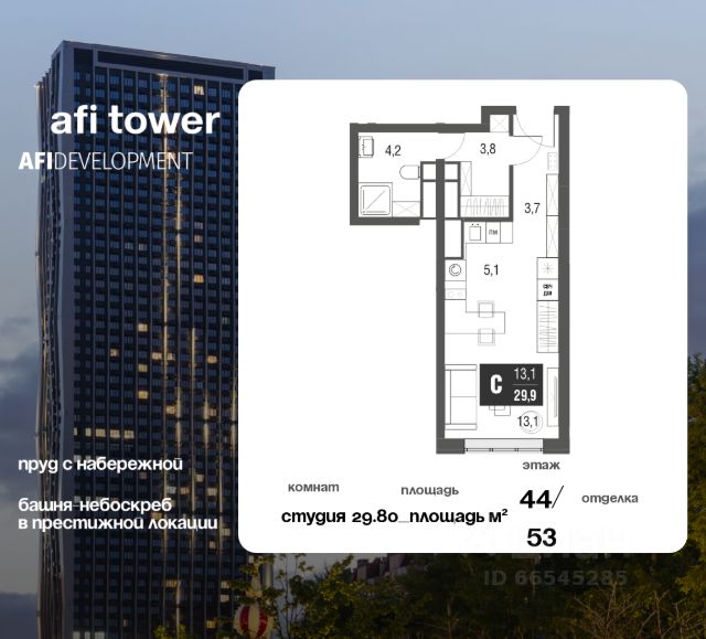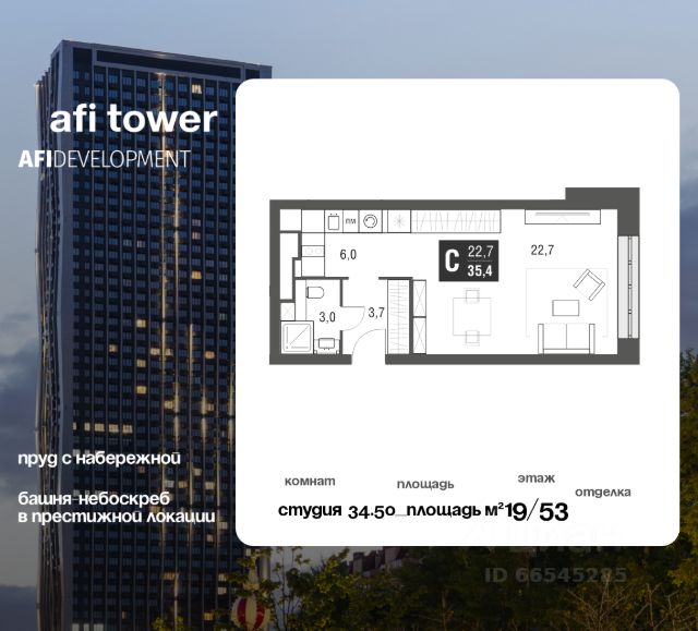 Студия площадью 34.50 площадь кв.м., расположенная на 19 этаже 53-этажного небоскреба бизнес-класса это именно то, что вы ищете! AFI Tower — это не просто жилой комплекс. Это место, где каждая деталь заботливо продумана, чтобы сделать вашу жизнь удивительной и комфортной. Транспортная доступность - AFI Tower расположен близко к проезду Серебрякова, что обеспечивает быстрый доступ к Третьему Транспортному Кольцу и МКАД. За 15 минут можно легко добраться до ключевых транспортных магистралей в зависимости от дорожной ситуации. - В пешей доступности находятся станции метро "Свиблово" и "Ботанический сад" — это дает возможность жителям легко перемещаться по городу. Рядом также расположена станция Московского центрального кольца у "Ботанического сада". Архитектура: - Башня AFI Tower привлекает своим смелым архитектурным решением. Фасад, выполненный в виде мягкой волны, делает здание узнаваемым и уникальным в контексте стандартных высоток. С высотой в 182,4 метра, она становится неповторимой доминантой в Свиблово. Внутренняя инфраструктура: - Лобби AFI Tower выделяется современным дизайном, высокими потолками от 2,9 м до 3,3 м и использованием качественных материалов. Это визитная карточка здания, предоставляющая посетителям первое впечатление. Внутреннее пространство продумано для комфорта и функциональности. Характеристики квартир: - Здесь каждая квартира — уникальная история. От 19 до 116 м² площади, три варианта отделки — светлый, темный или white box, чтобы ваш дом отражал ваш вкус и стиль. Принимайте решение не просто о покупке жилья, а о создании своего собственного уютного уголка. Удобства внутри AFI Tower: - В самом доме целый мир удобств и развлечений. Ресторан, библиотека, прачечная и коворкинг — каждое место наполнено энергией и возможностями. Вечерами, уютная кинозона с кинопроектором и настольными играми создает атмосферу веселья и отдыха. Экология и окружение: - Жить в AFI Tower — значит быть частью уникального окружения. Близость к пруду и зеленому скверу придает местности неописуемое очарование. Вид из окон на Москву, ВДНХ и парки создают вдохновляющий пейзаж. А безопасность и удобство парковки добавляют приятные моменты к вашему образу жизни.
